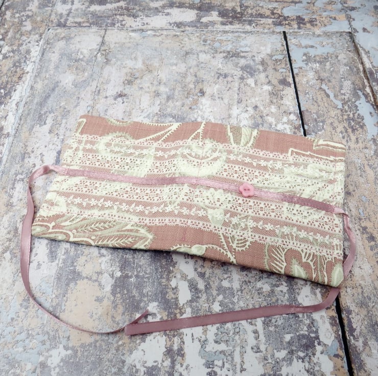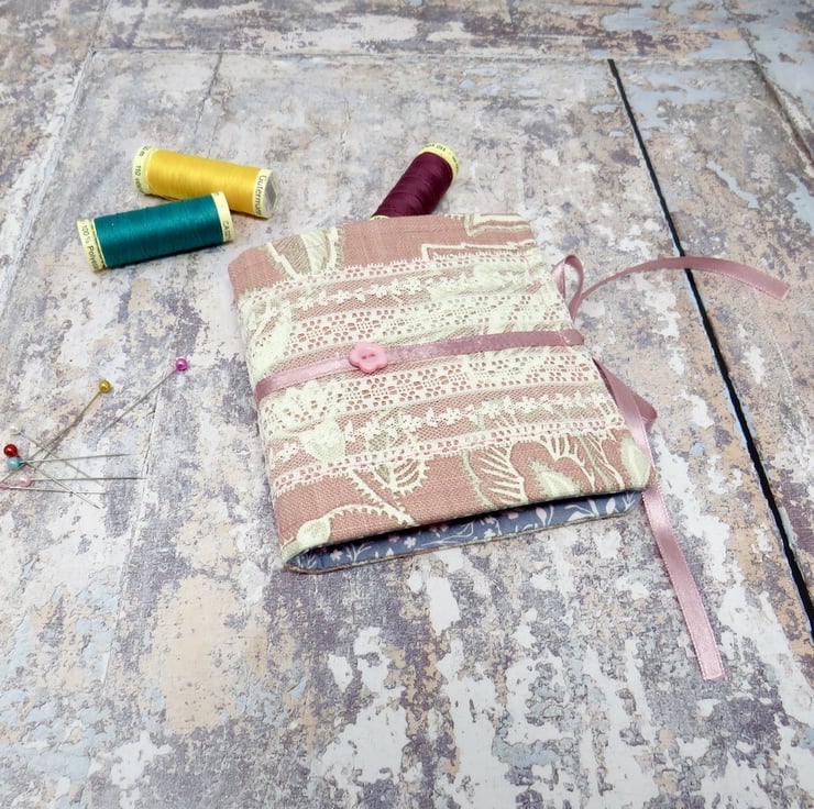 It has a pink cotton cover with a wide ivory lace trim overlaid with a narrow pink ribbon which becomes the tie closure for the needle case, and it's lined with a grey cotton. The needle case has a pocket for your embroidery scissors and another for the thread card.