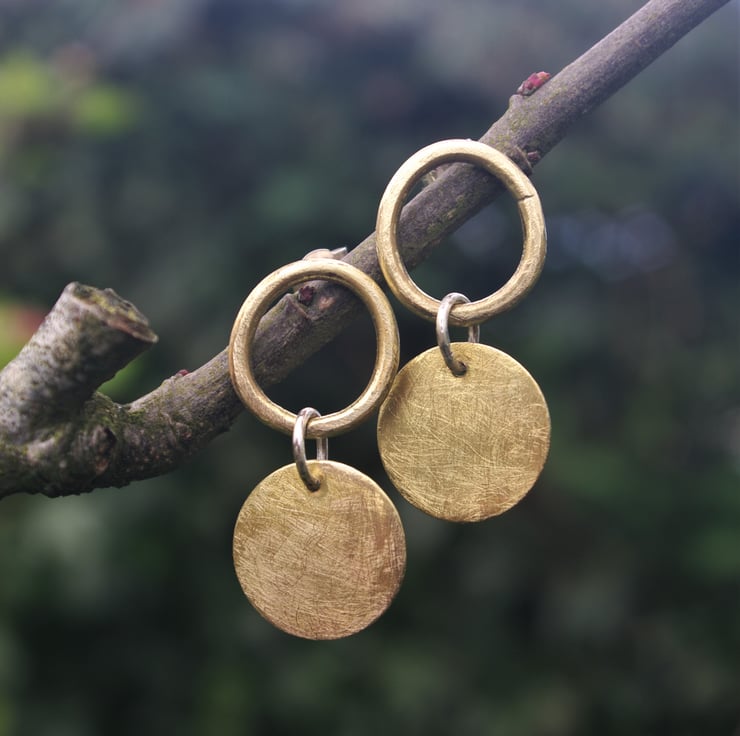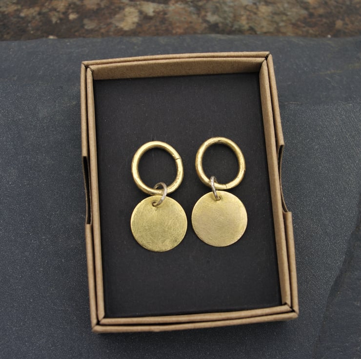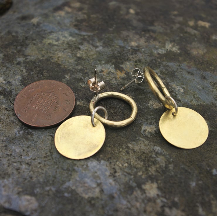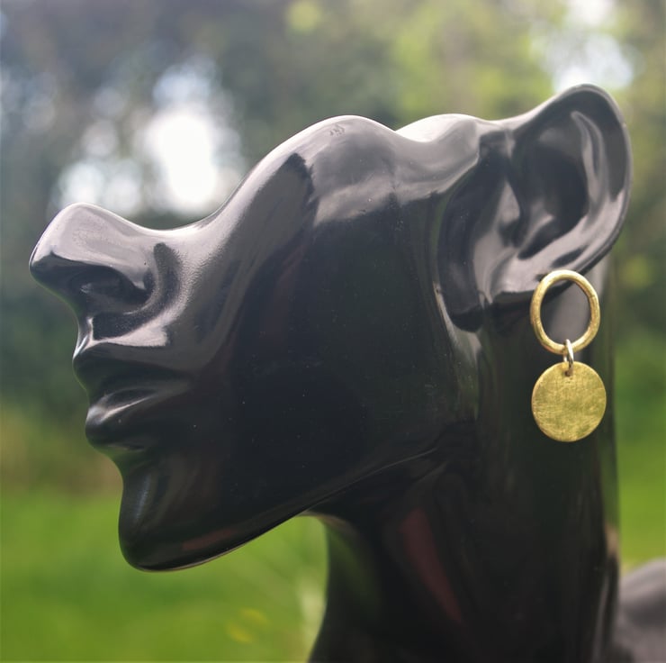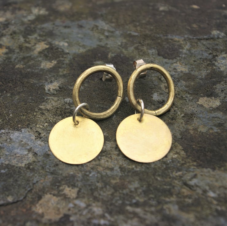 A brass circular disc dangles from a brass ring which sits neatly on the earlobe . They fasten to the ear with sterling silver ear posts and scroll backs.