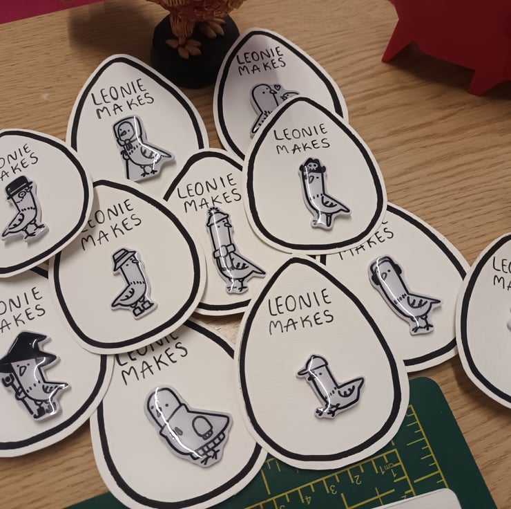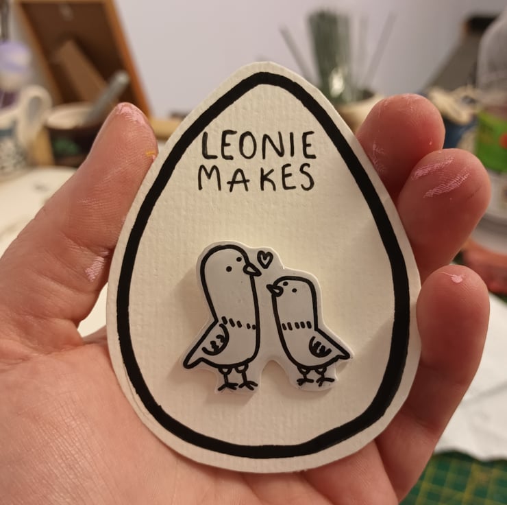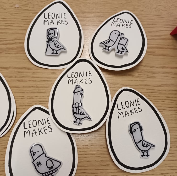 These handmade pigeon badges are each a unique hand drawn illustration, no two are the same.