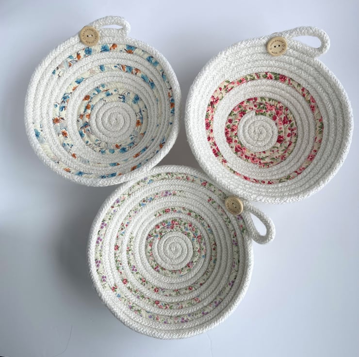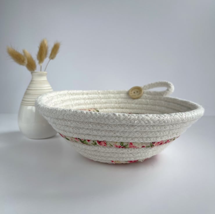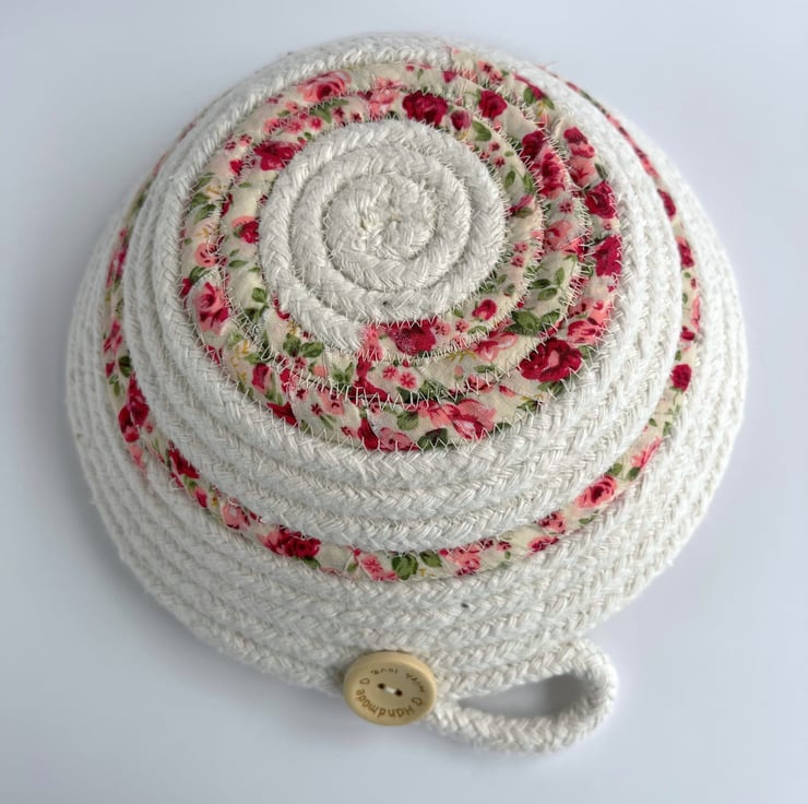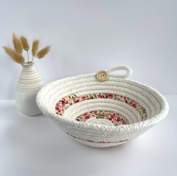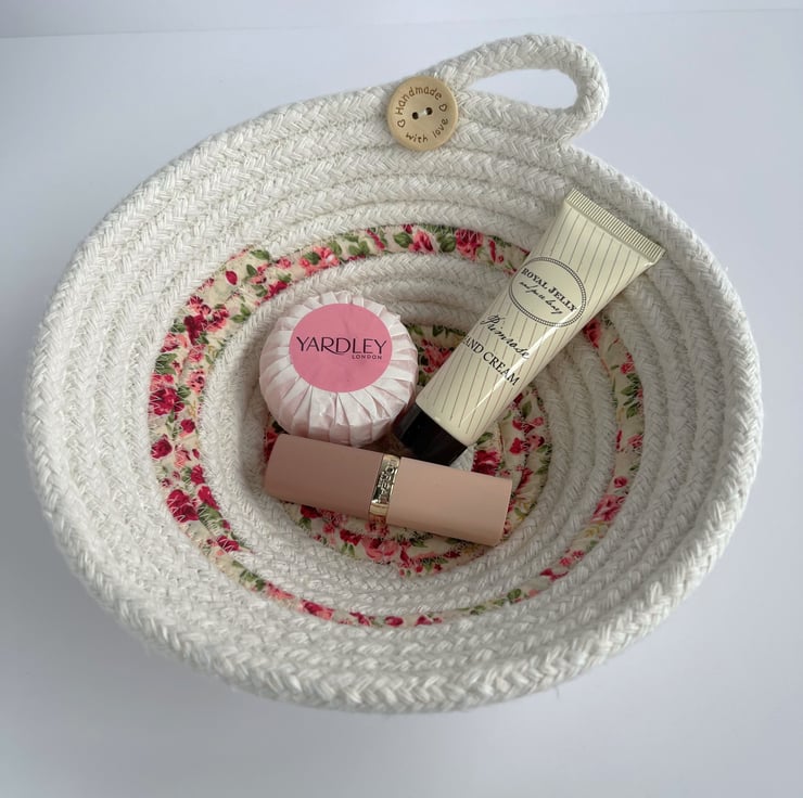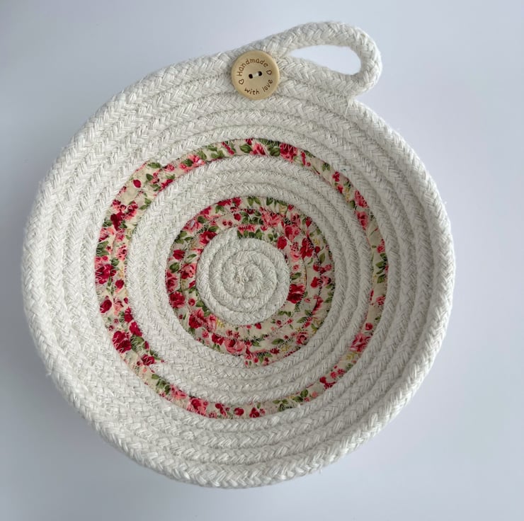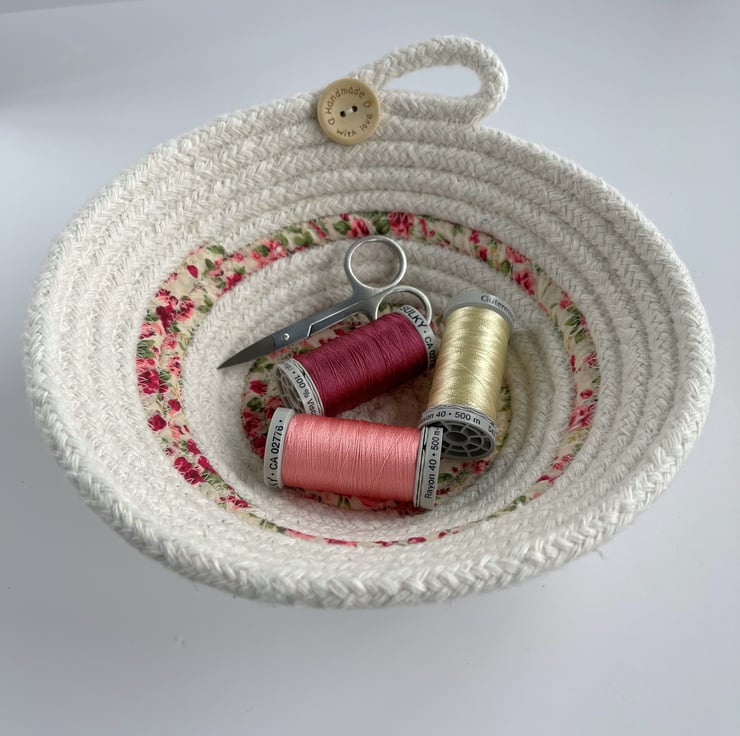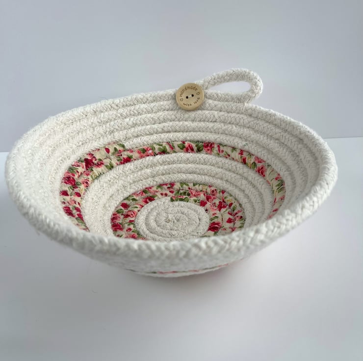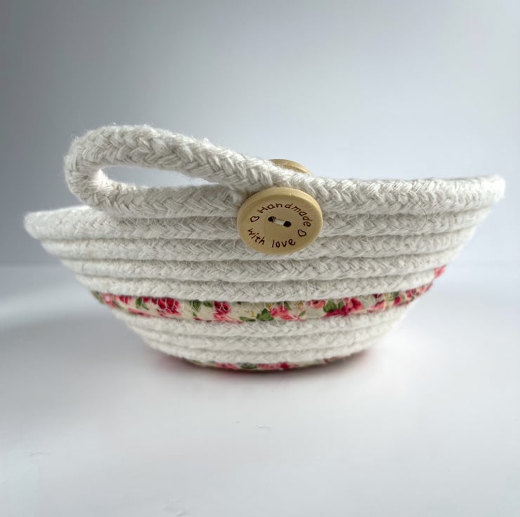 This decorative bowl has been made from natural ivory coloured cotton rope, coiled and machine-stitched into a bowl shape. During the coiling and stitching process, sections of the rope have been wrapped with strips of floral fabric, to give pretty stripes to the finished bowl. The fabric is cream with a floral pattern in shades of pink and green. The dish has been finished with a loop and two wooden buttons, one on the inside and one on the outside of the bowl. The natural wood buttons are inscribed with the words “Handmade with love” and two tiny hearts.