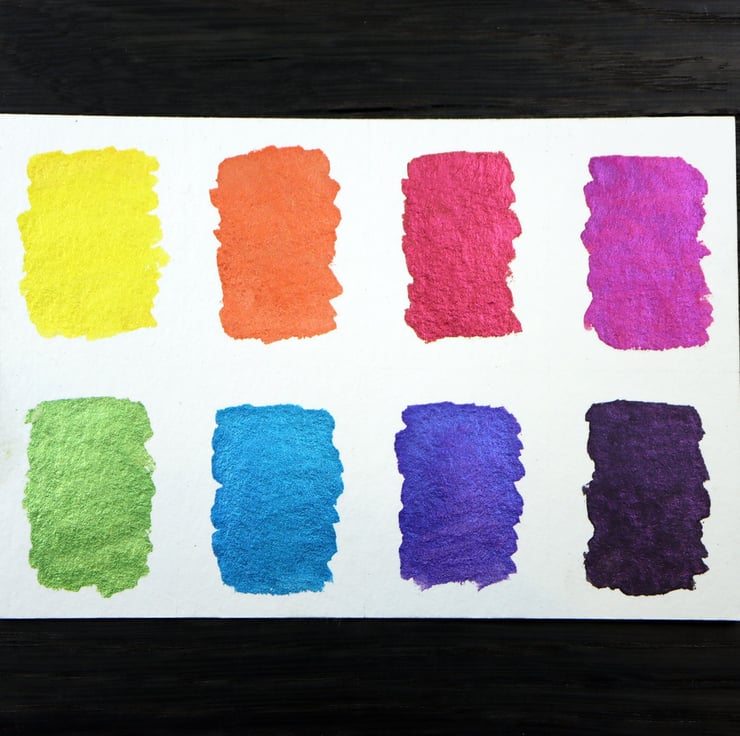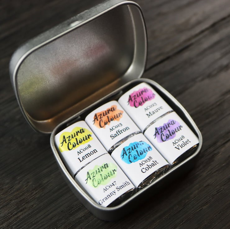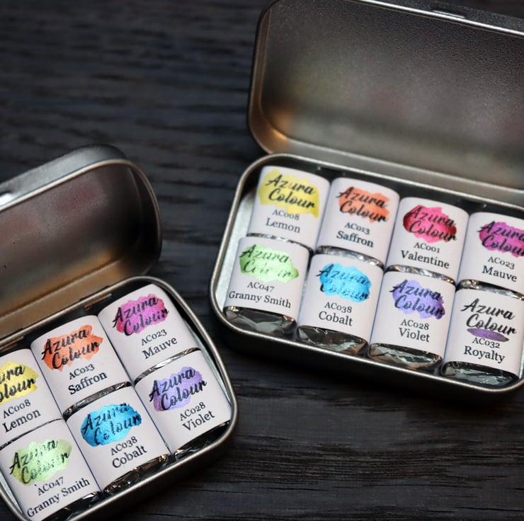 This is the order of paints shown on swatches and full set comes in a tin as pictured.