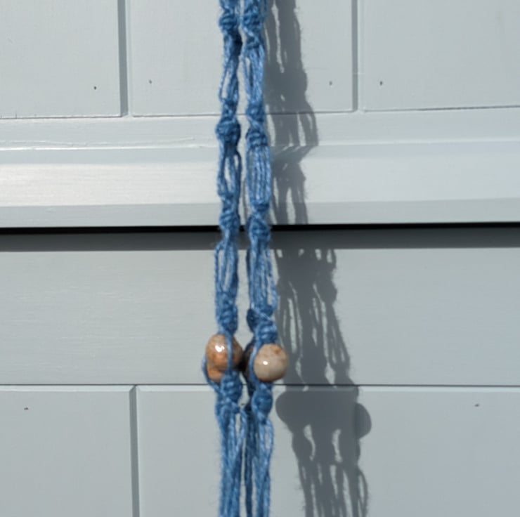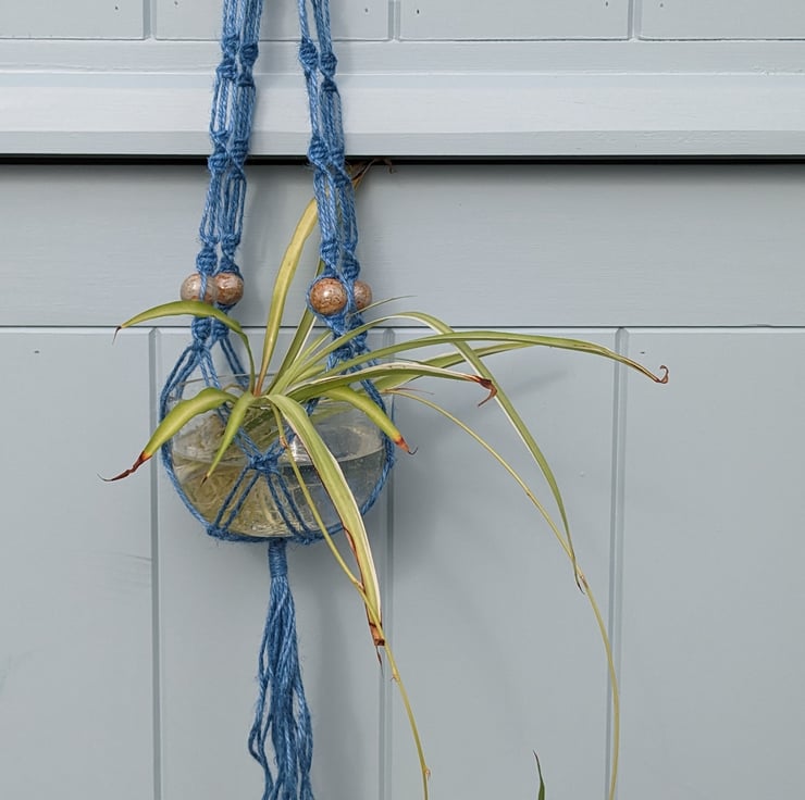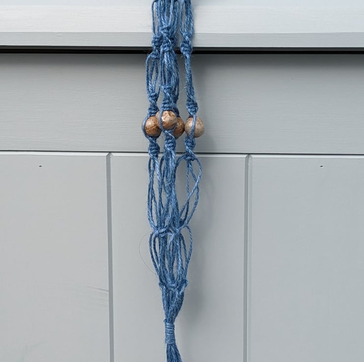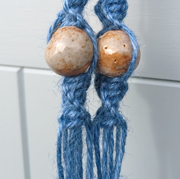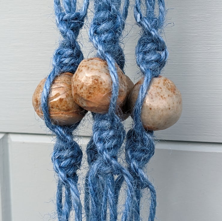 A beautiful handmade hanging basket, made using 100% pure jute cord in bluebell blue colour, a natural wooden ring to hang the basket from, and handmade ceramic beads coated in a natural glaze made using wood ash from a lovely old ash tree that had to be cut down. The beads are designed to look handmade and are not all identical. The jute is high quality, and sustainably and ethically produced by Nutscene, a UK producer.