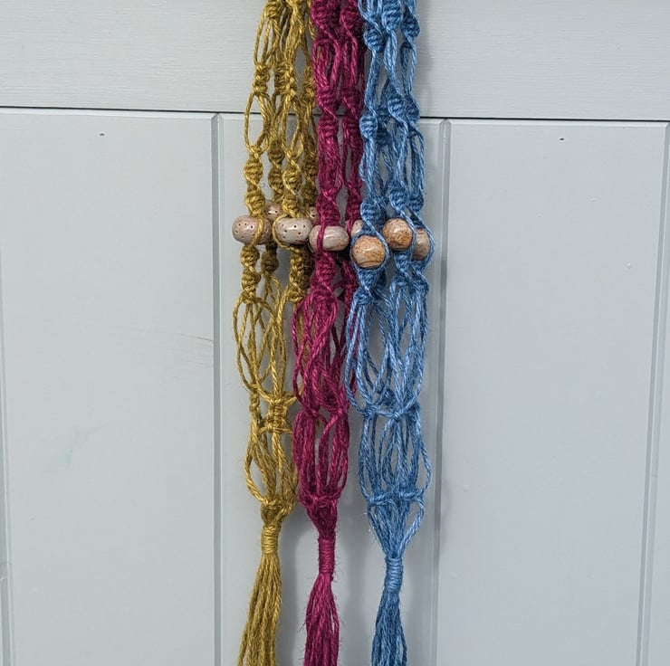 Macramé Jute and Ceramic Bead Hanging Basket Plant Pot Holder Handmade in Wales in Natural Materials.