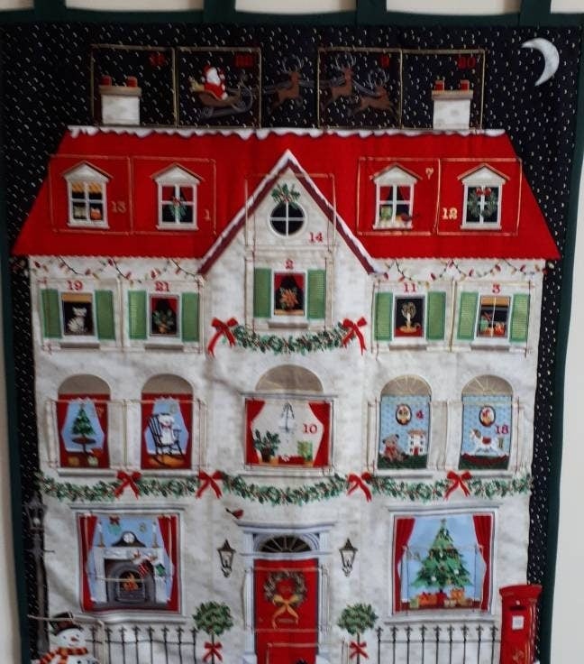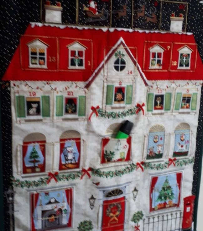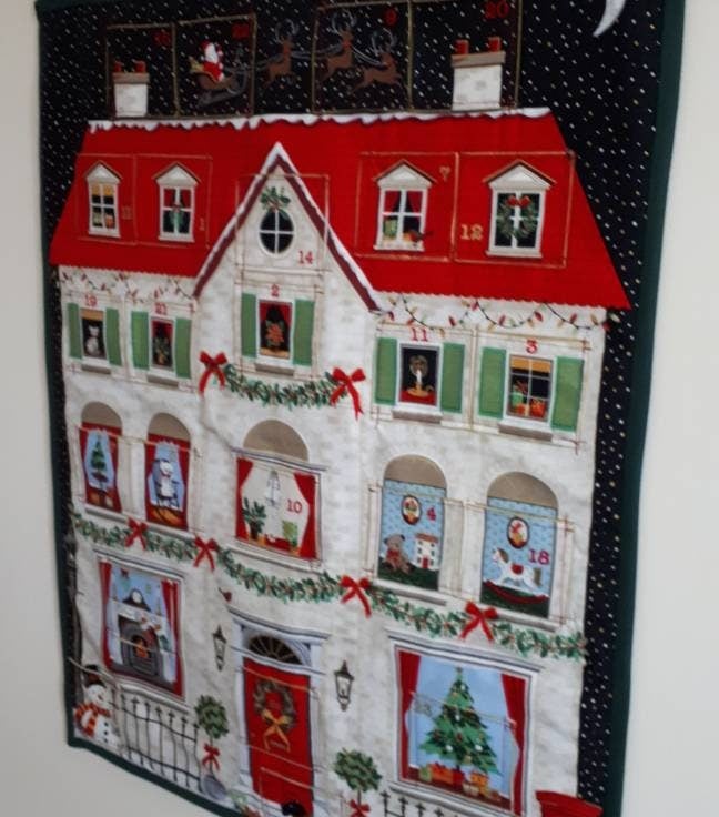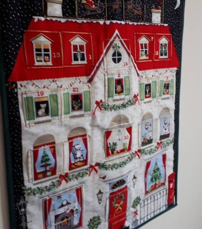 This traditional reusable house fabric advent calendar with pockets will be a real heirloom for your family. Entirely handmade, it has 24 numbered pockets and a soft filling which adds a luxurious touch. In two of the photographs I have shown a standard size highlighter in one of the pockets, to give you an idea of scale (please note that the highlighter isn't included in the sale!).