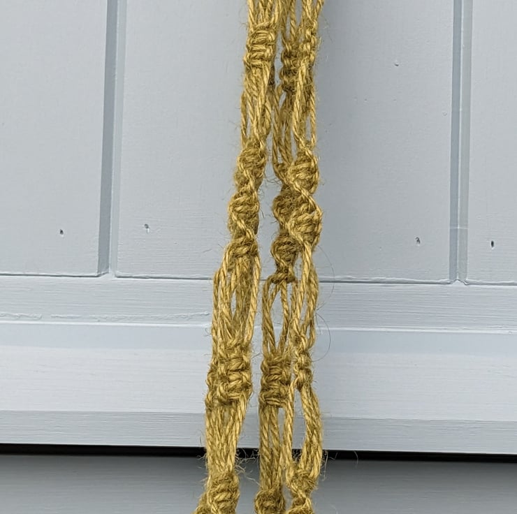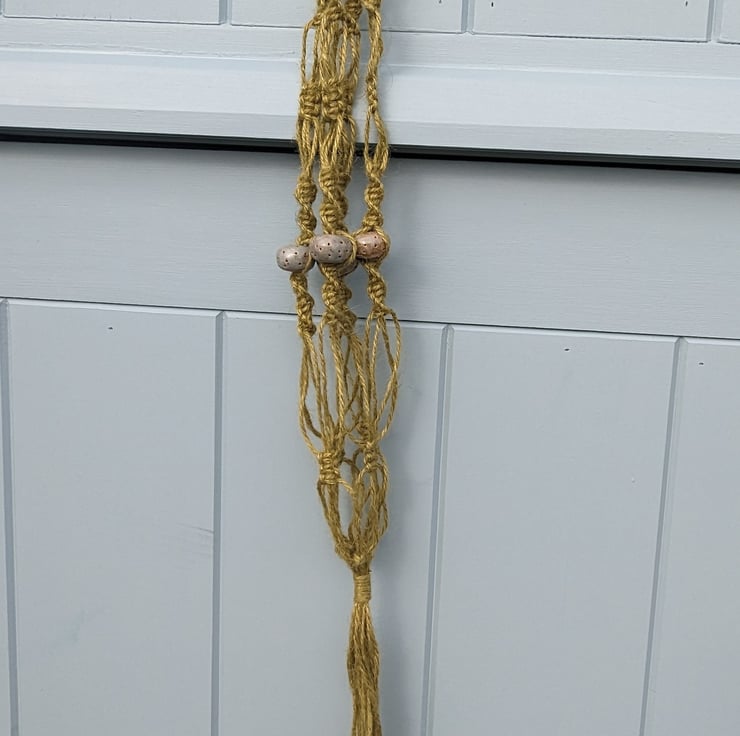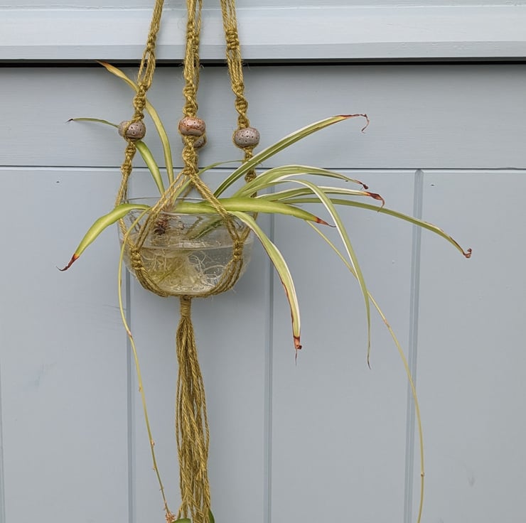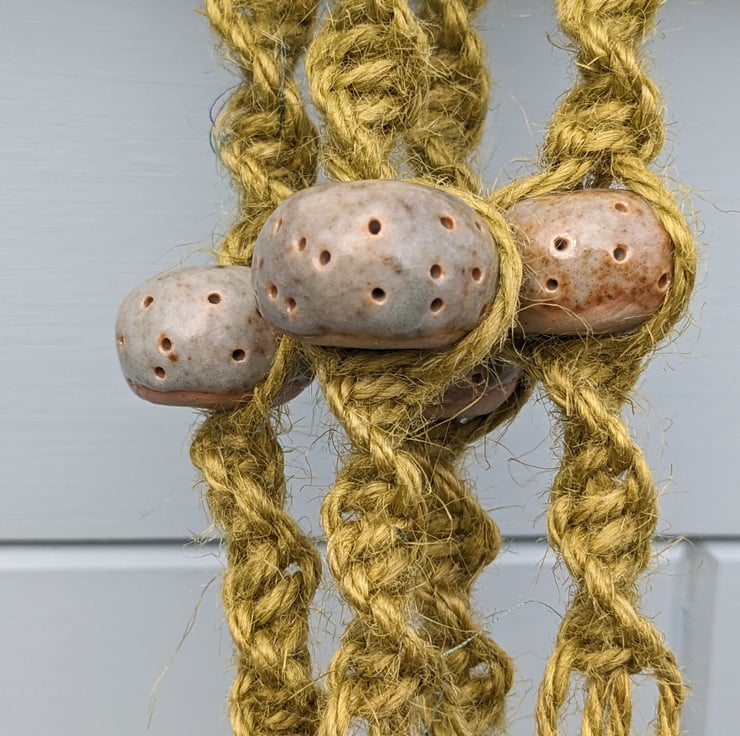 Macramé Jute and Ceramic Bead Hanging Basket Plant Pot Holder Handmade in Wales in Natural Materials.