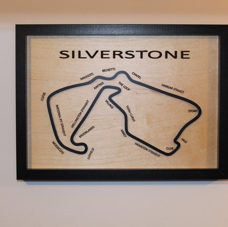 Introducing the unique and exclusive Hand Made Silverstone Race Circuit the perfect gift for any motorsport enthusiast. This 3D printed circuit is a faithful recreation of the famous race track and includes all corner and straight names engraved, mounted to a piece of A4 or A5 Birch ply wood. The entire circuit is presented in a deep A4 or A5 black box frame, making it an ideal collectors item or wall decoration. Whether you're looking for a special birthday present or an impressive addition to your Sim cave, this Silverstone Race Circuit is guaranteed to impress.