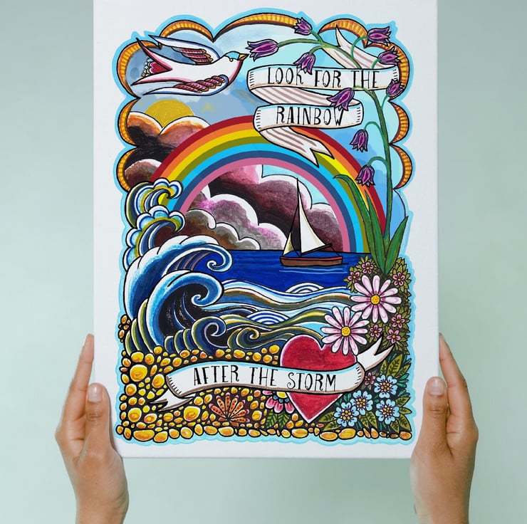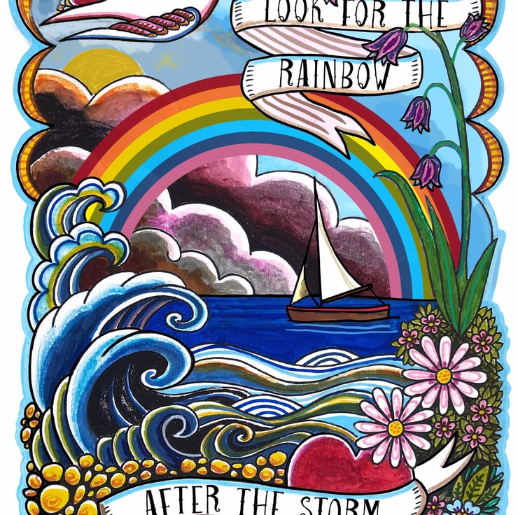 This is a print of an original drawing created using acrylic paint and pens. Featuring a bright rainbow appearing across the sea after a patch of stormy weather.