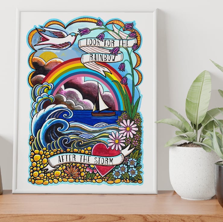 Featuring the positive quote Look For The Rainbow After The Storm I have drawn this print with tattoo art influences.