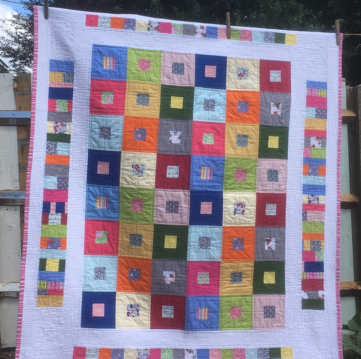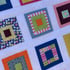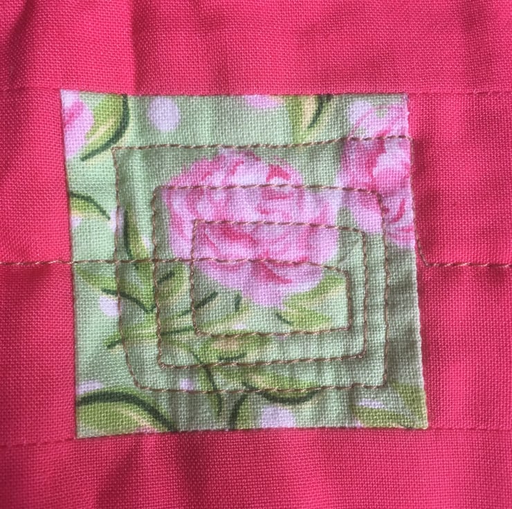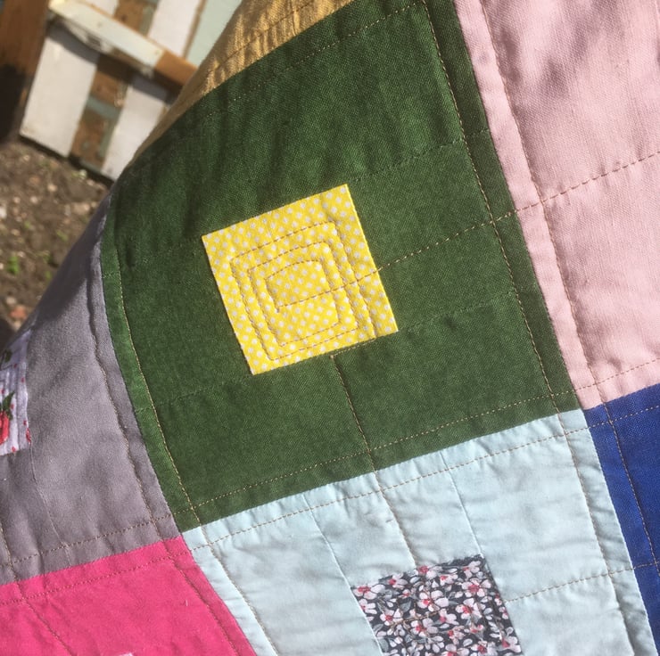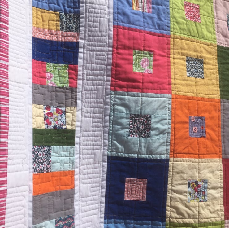 The 'square in a square' design is hand pieced and machine quilted with both straight line and free motion quilting creating various geometric patterns.