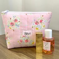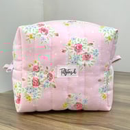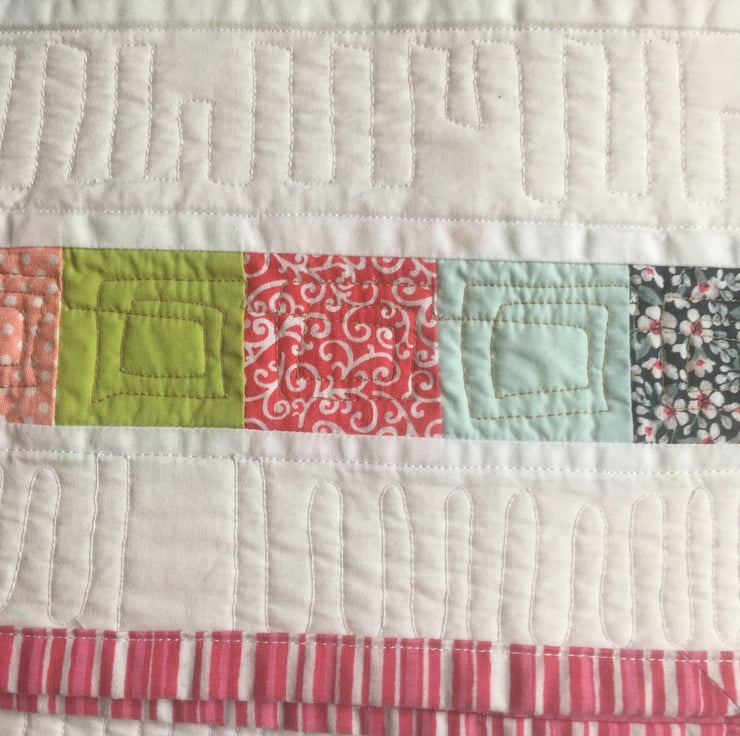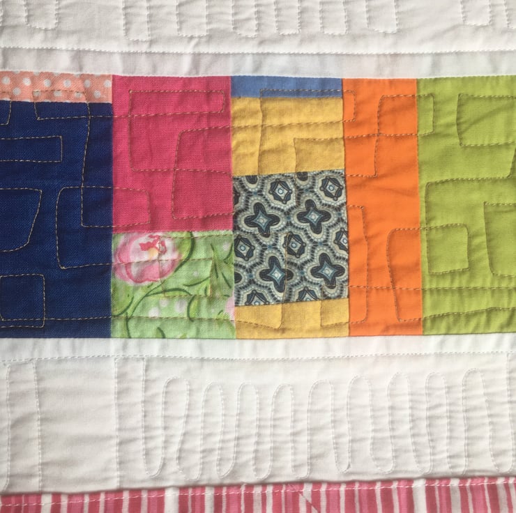 The quilt back and binding is made from a pink and white striped cotton fabric.