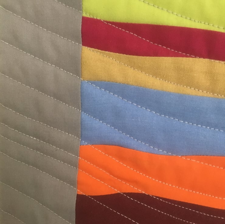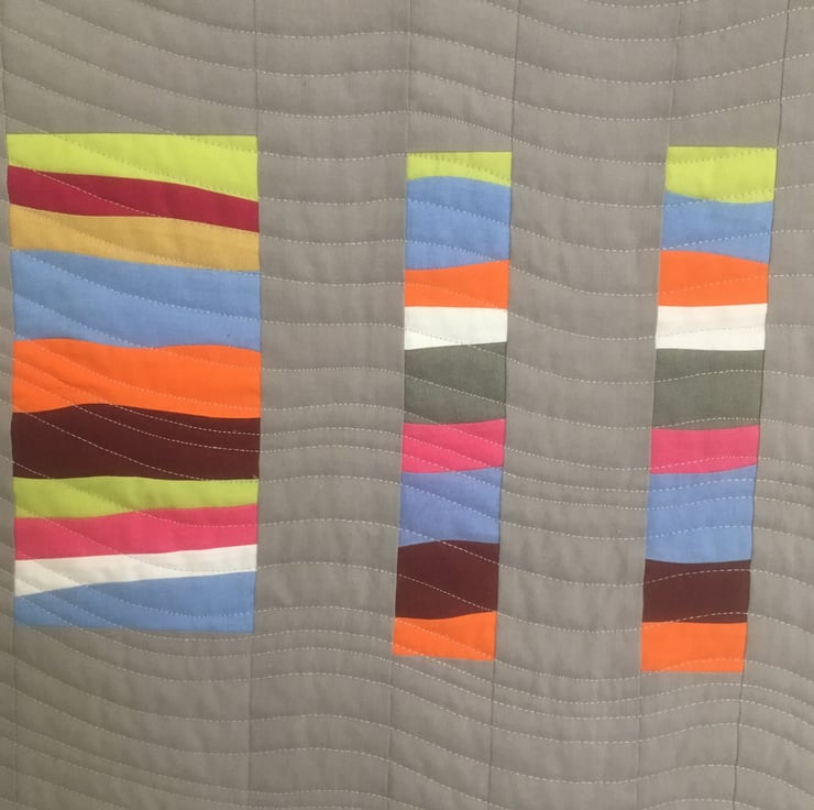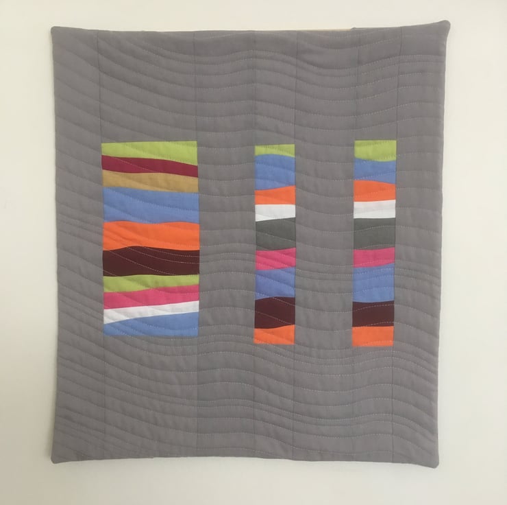 This contemporary textile wall hanging would be a unique addition to any room or hall way. Made with 100% cotton fabric, this wall hanging is hand pieced and machine quilted in a curved design which gives a wonderful flowing texture. The wall hanging is backed with a hand stitched binding which incorporates 4 corner pieces, these allow it to be hung in 4 different orientations. Wooden dowel is included.