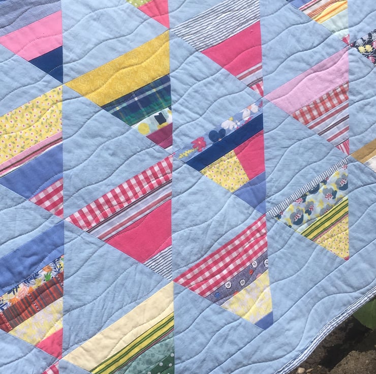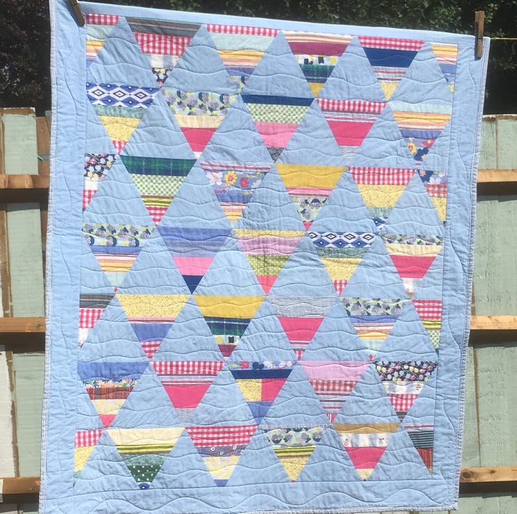 Delightful baby quilt in a triangle patchwork design. This adorable multi-coloured quilt is hand pieced and machine quilted in a wavy design. All fabrics are 100% cotton and the wadding is also cotton.