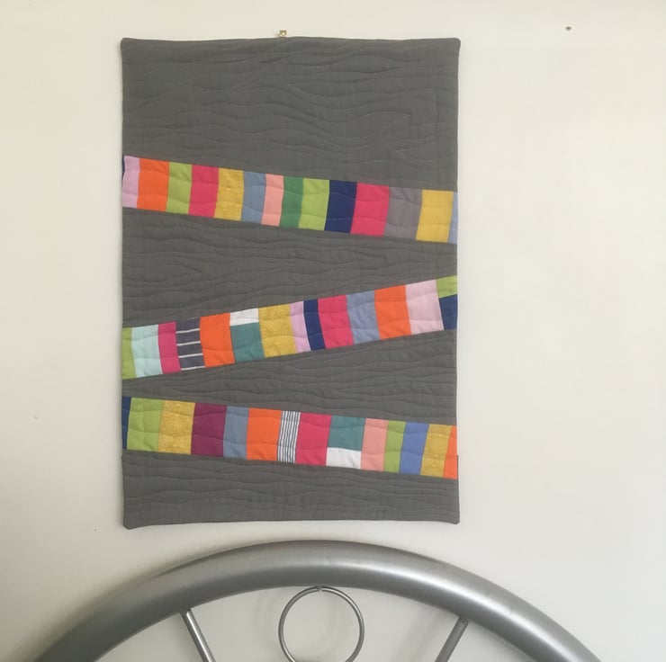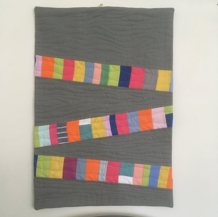This contemporary textile wall hanging would be a unique addition to any room or hall way. Made with 100% cotton fabric, this wall hanging is hand pieced and machine quilted in a curved design which gives a wonderful flowing texture. The wall hanging is backed with a hand stitched binding, wooden dowel is included.