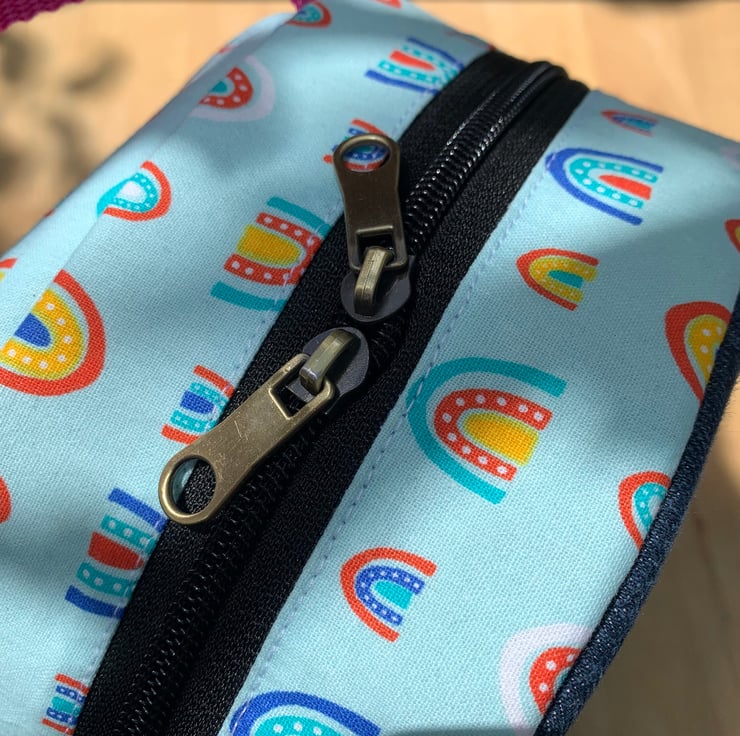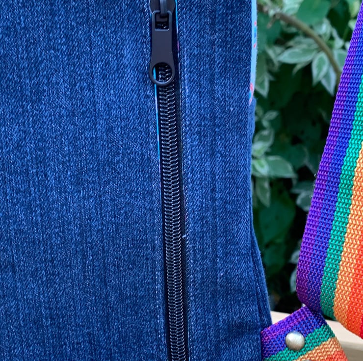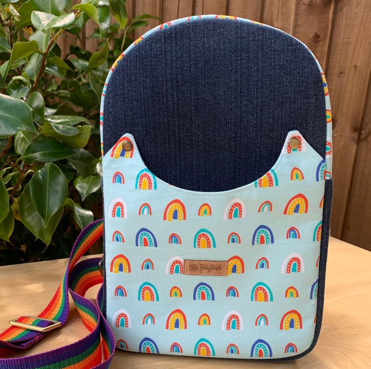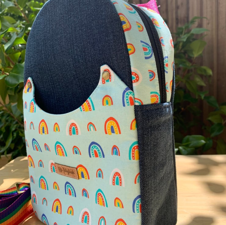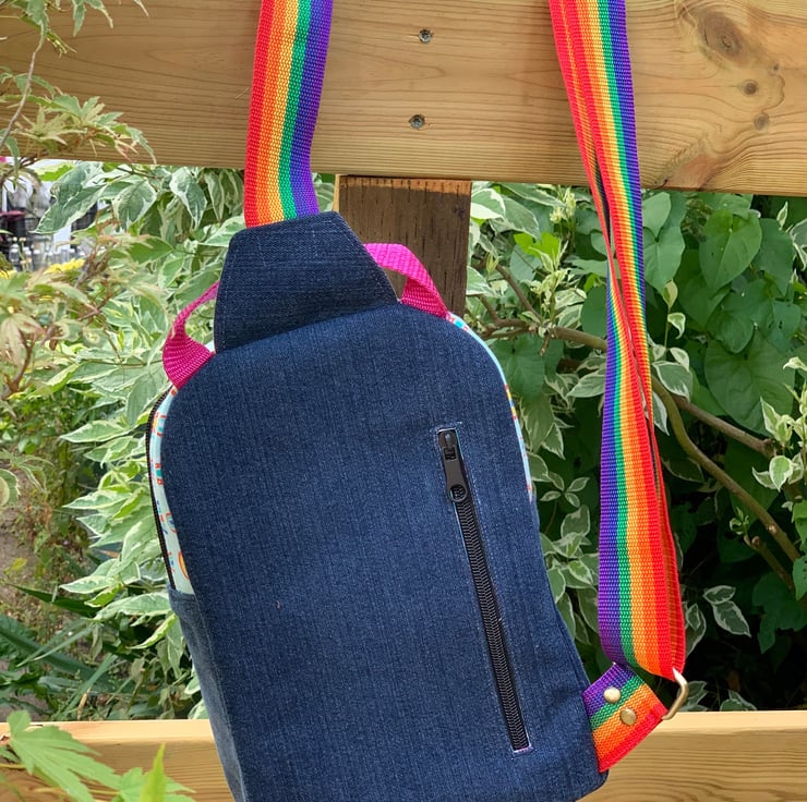 Beautifully handcrafted sling bag/mini backpack in a pale blue rainbow design cotton and re-cycled denim fabric.