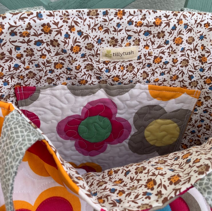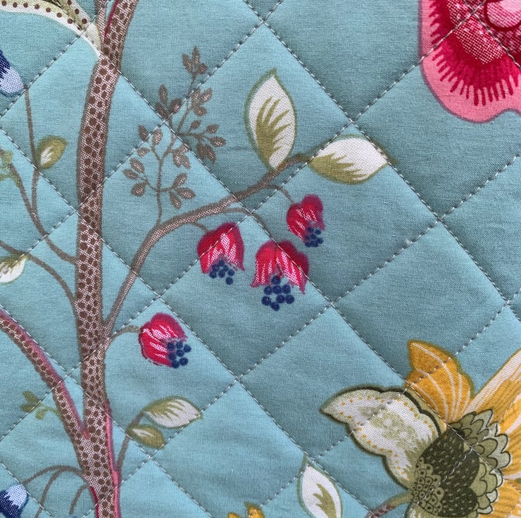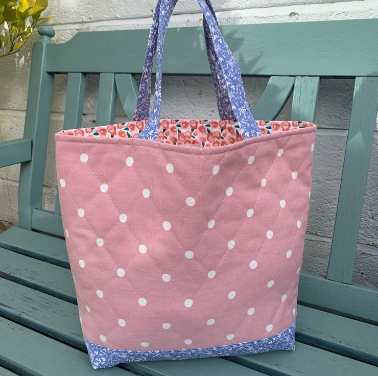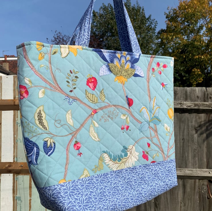 Beautifully handcrafted quilted tote bags in a choice of colours and designs. These roomy tote bags are made in 100% cotton fabrics, are fully lined and have an internal slip pocket. The bags are machine quilted and padded with cotton wadding which makes them very robust but also gives them a soft squidgy feel. The bags have generous boxed corners which makes them extremely roomy. These bags are ideal for everyday wear, shopping or for carrying your laptop.