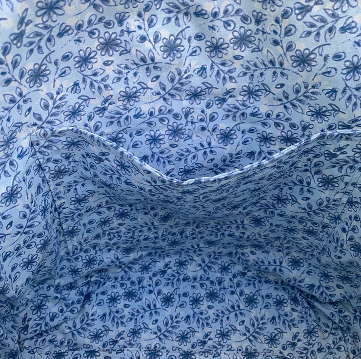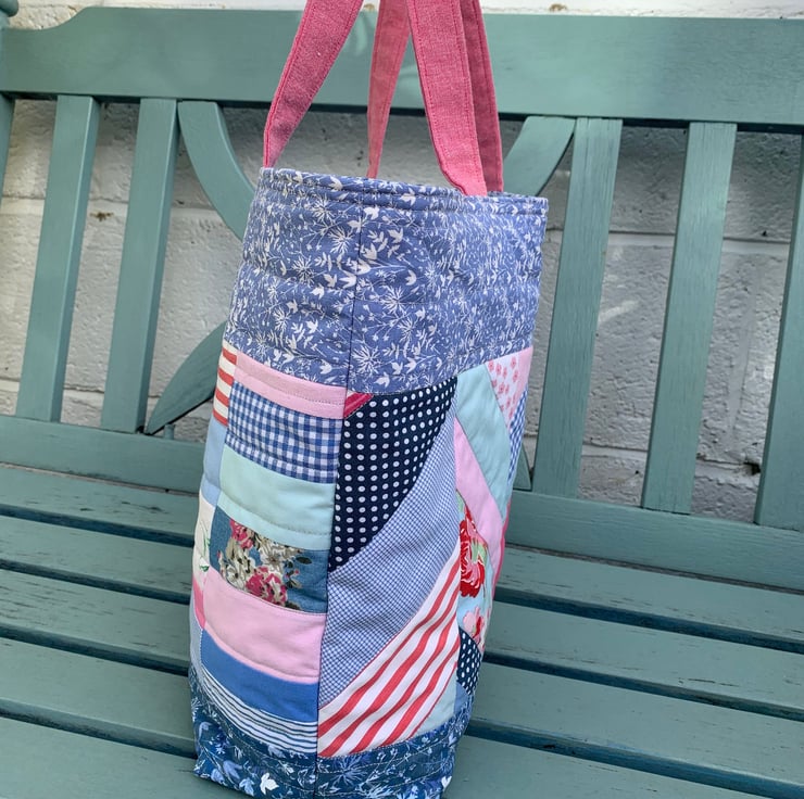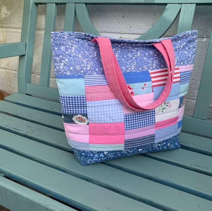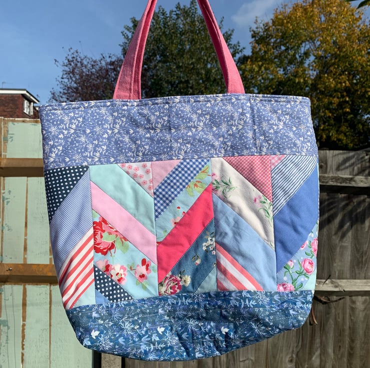 Delightful handcrafted patchwork quilted tote bag in blues and pinks, it has a chevron design on one side and a horizontal block design on the reverse side. This roomy tote bag is made in 100% cotton fabrics, is fully lined and has an internal slip pocket. It is hand pieced and machine quilted. The bag is padded with cotton wadding which makes it very robust but also gives it a soft squidgy feel. It has generous boxed corners which make it extremely roomy. This bag is ideal for everyday wear, shopping, laptop bag. It would also make a great baby shower gift.