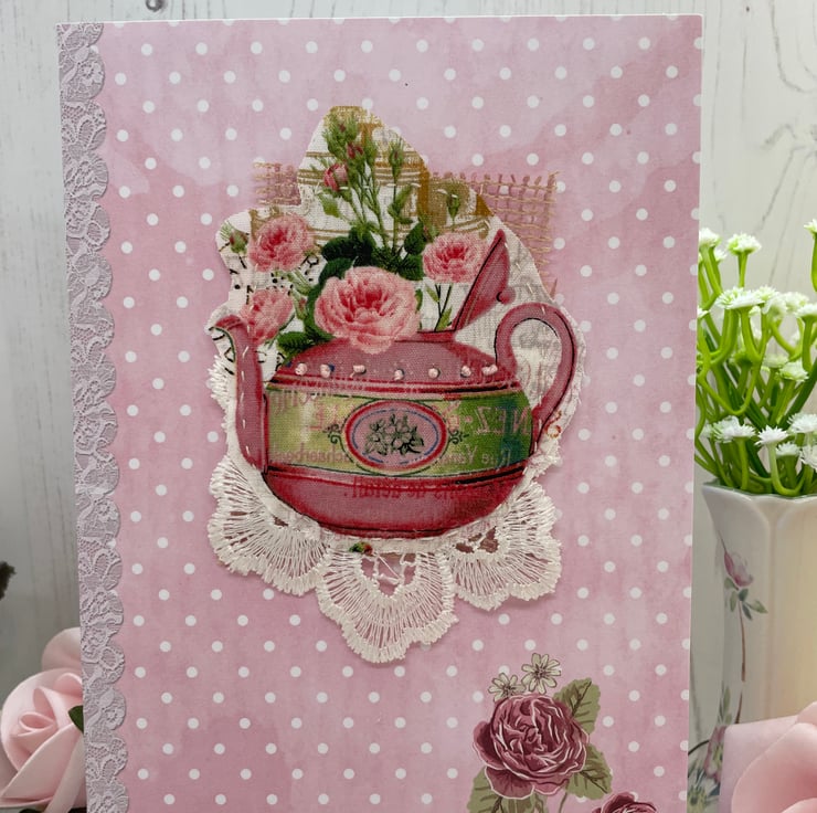 The topper on this card is a hand built snippet, mounted onto felt. Tea pot and flowers, fussy cut and hand stitched in place. French knot embroidery and a diamanté. Mounted onto an appliqué of lace and pink mesh background fabric.