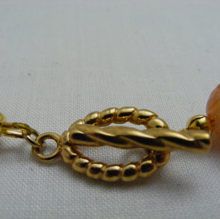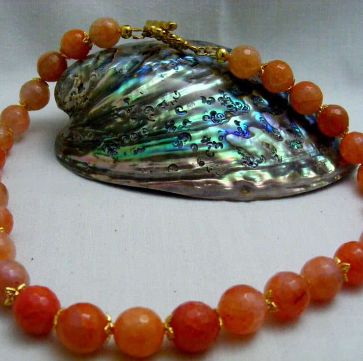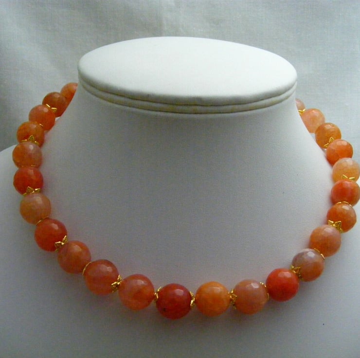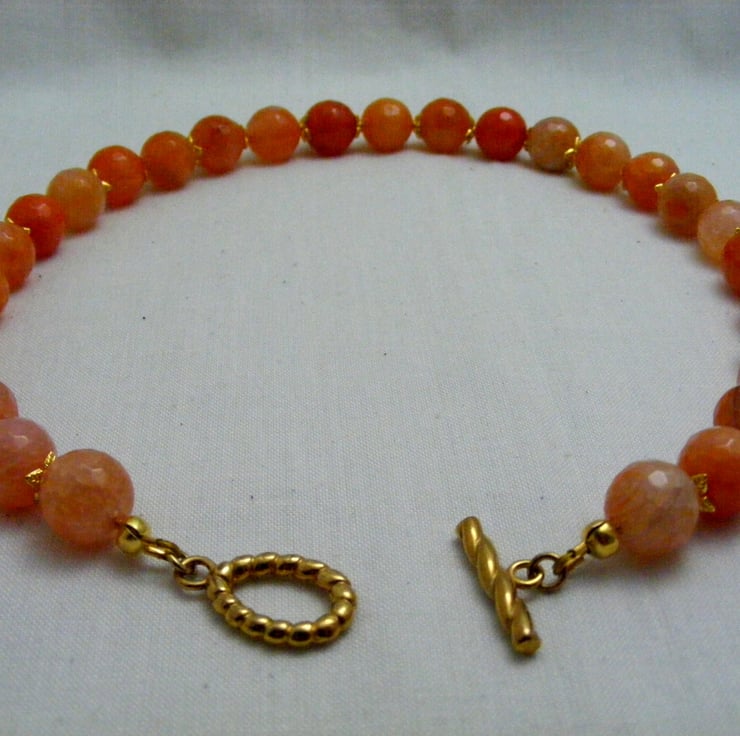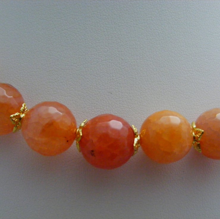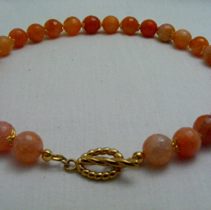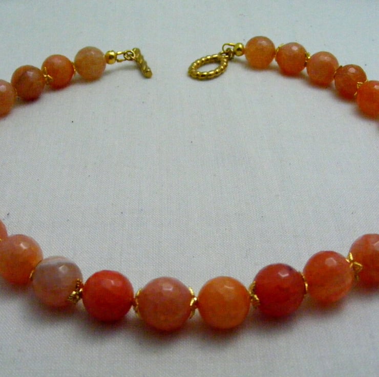 I've handmade this lovely orange agate gemstone necklace using, 12mm faceted orange agate beads, 5mm gold plate beadcaps, beading wire, gold plated findings and a gold plated toggle clasp.