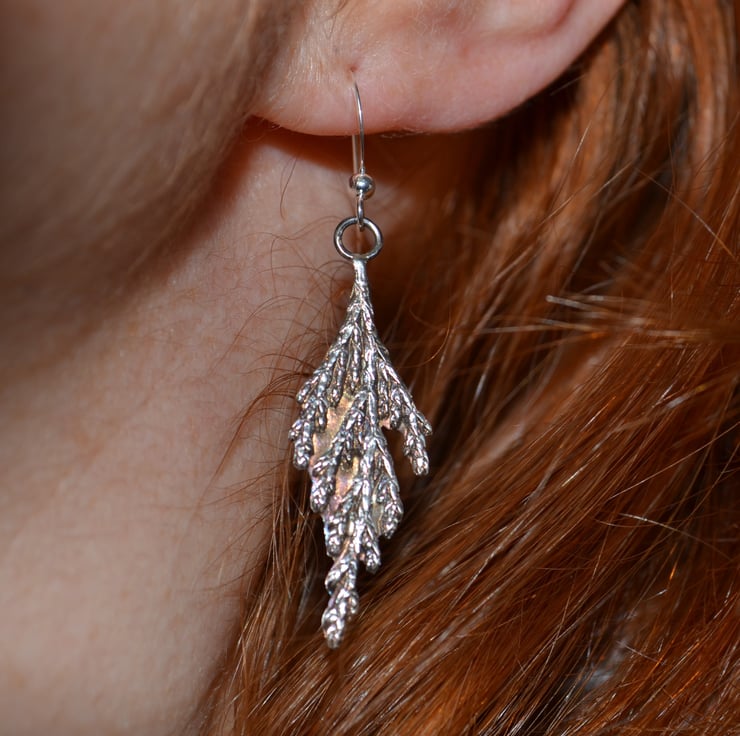 These earrings are made from precious metal clay which is recycled silver that produces a 999 fine silver piece of jewellery. I use real evergreen leaves to make the profile elements of this piece. It is then oxidised for finish. All lovingly handmade and unique and so mild variation may occur from product picture. Jewellery is delicate and will tarnish with time and wear. Clean carefully with a silver cloth. Sterling silver ear findings. Dimensions 52x18mm
