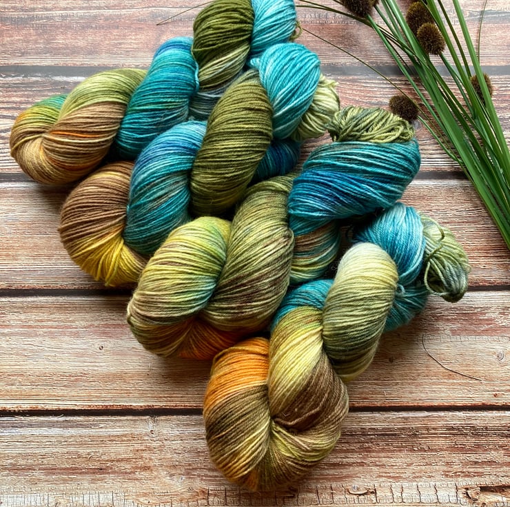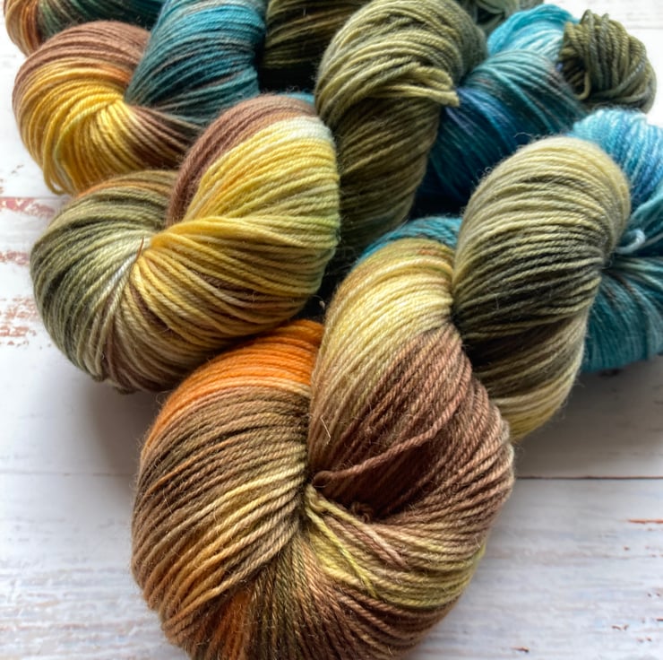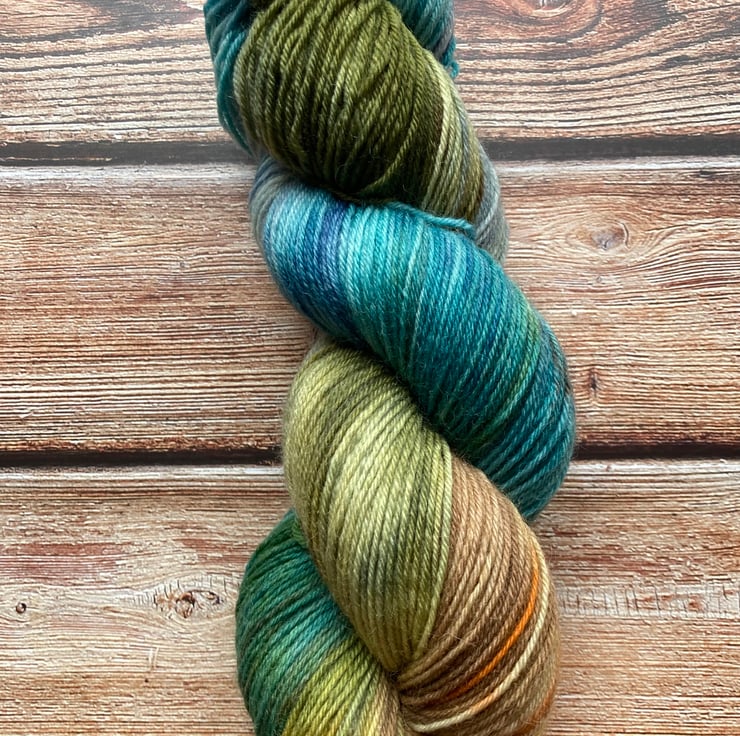 Skein of hand dyed yarn 75/25 merino nylon that has bounce and beauty and great for socks, shawls, mitts or whatever takes your fancy.