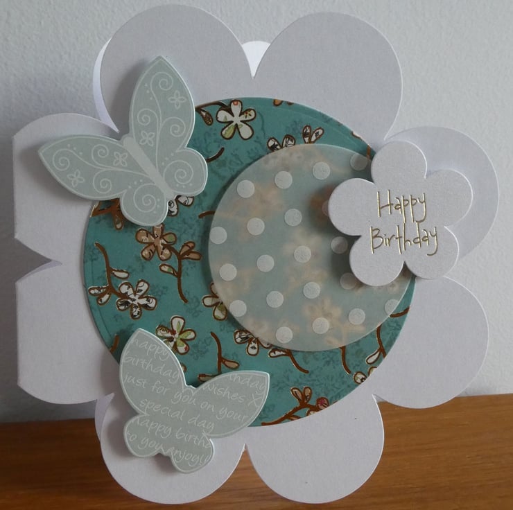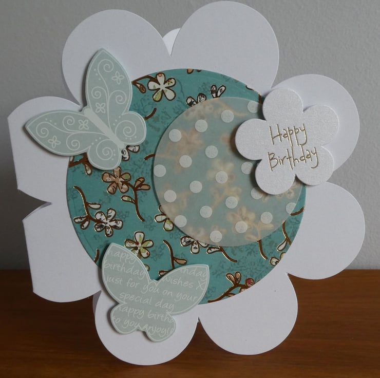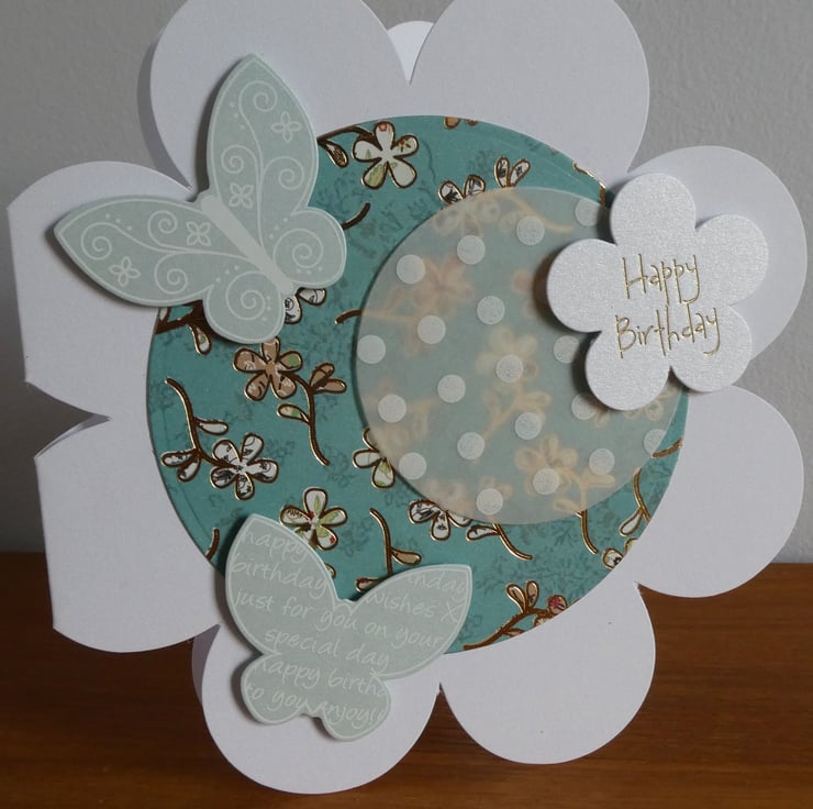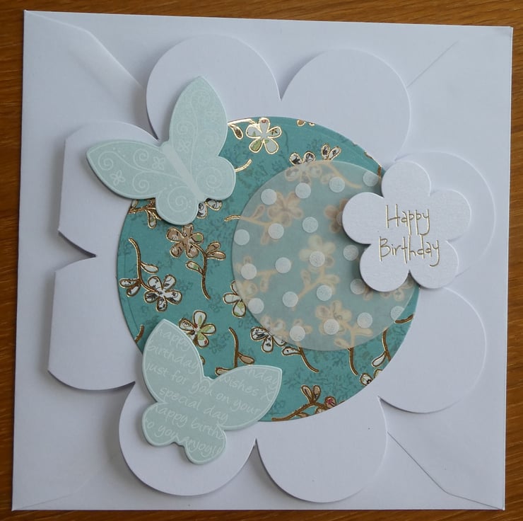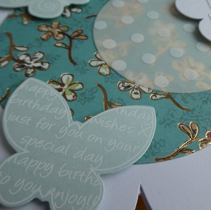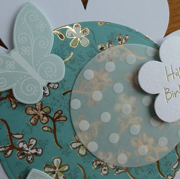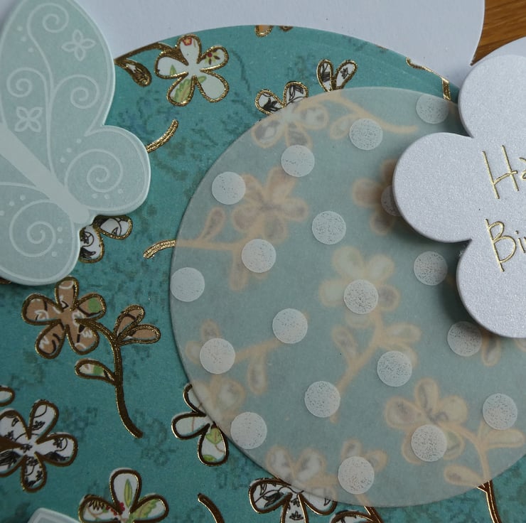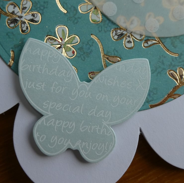 It has a circle of bright green/bluel floral patterned card with gold metallic detail in the centre. This has then been layered with a circle of dotty patterned vellum, 2 pearlescent butterflies with white details and a flower shaped message with the words ''Happy Birthday'.