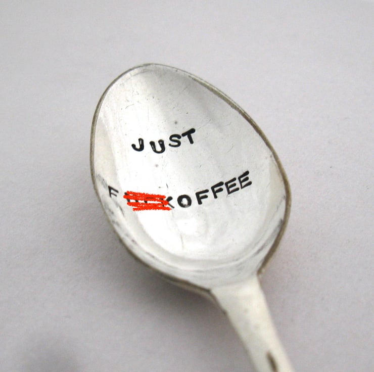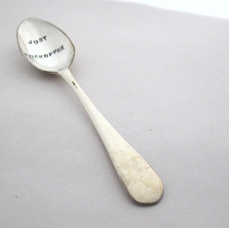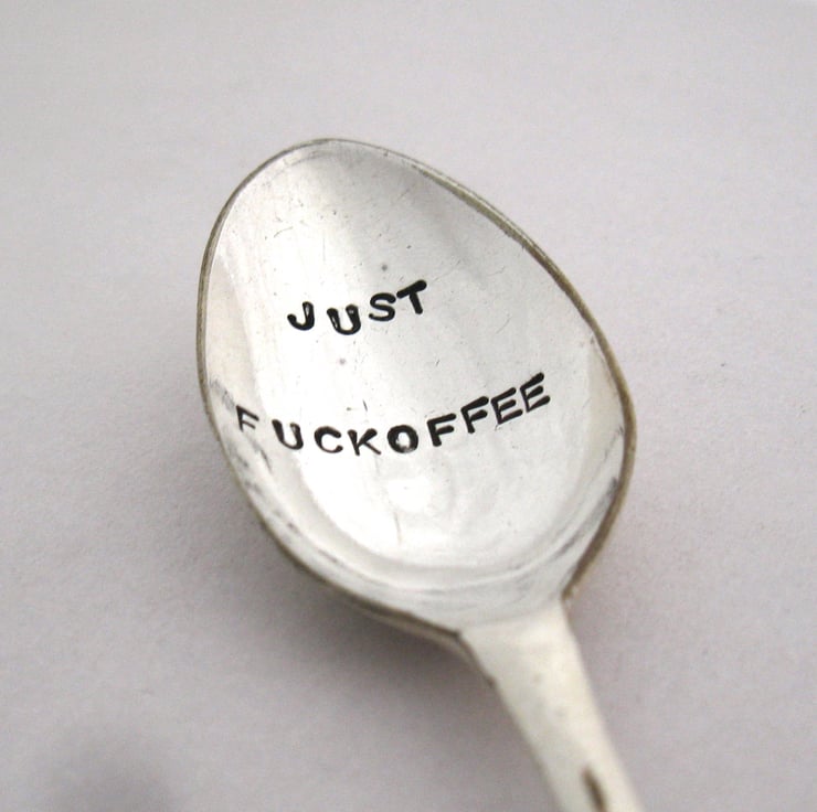 A small and rather battered vintage coffeespoon with the pithy wording JUST F--KOFFEE hand stamped in small but very clear block lettering in the bowl. An ideal small gift for someone who's grumpy and antisocial until they've had their coffee!