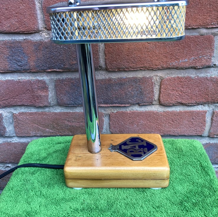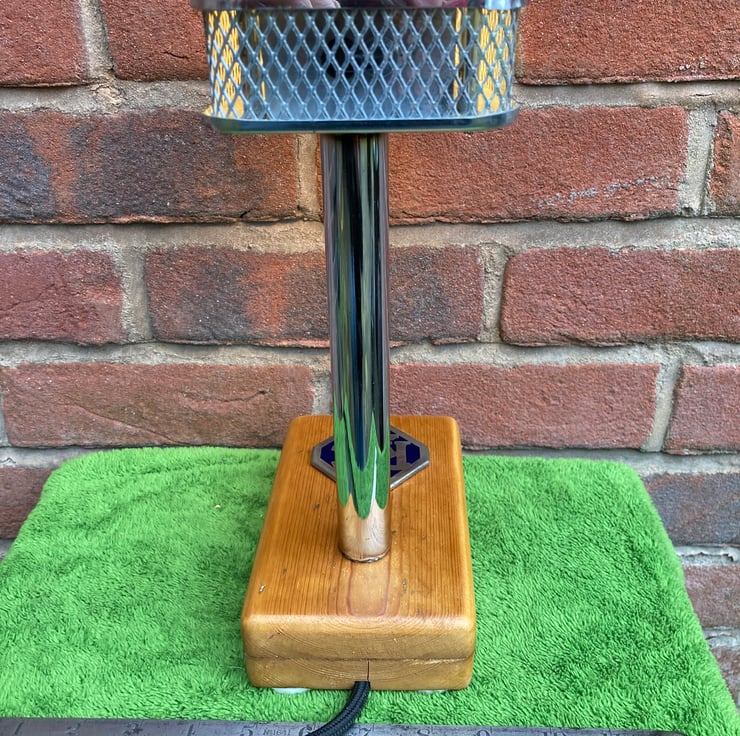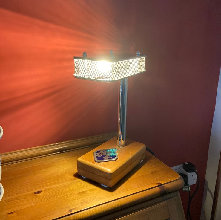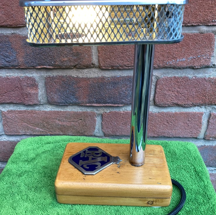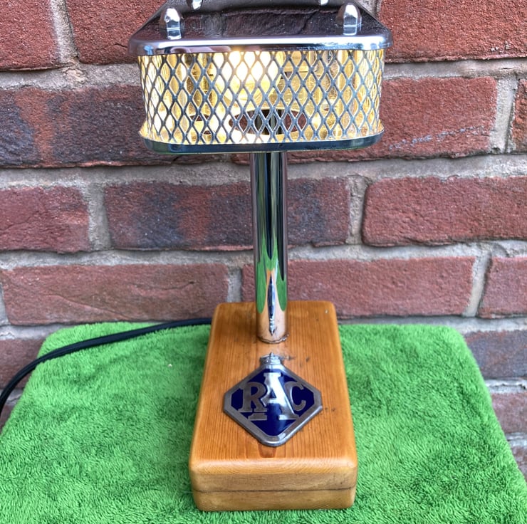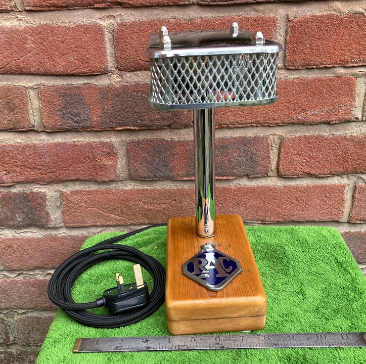Add some automobilia style to your home, a classic car themed table lamp based on a 1970s period aftermarket performance air filter with a vintage metal RAC badge as a touch switch, it would make an ideal bedside lamp. I have cleaned the NOS chrome air filter, which does have a few marks as evidence of many years on a motor factor’s shelf, and mounted it on a 1-inch (25mm) diameter chrome tube leg. The leg is bolted to a French polished wooden base, made from two pieces of old floorboard, which houses a touch dimmer unit which is activated by touching a vintage metal RAC badge; touch once to switch on dim lighting, touch again to brighten, touch a third time to full brightness and a fourth to switch off – see the video. Power is supplied through 2 metres of black fabric braided flex fitted with a black 3-amp fused UK plug. As always from Steampunk Creative Engineering, all electrical components are brand new and the unit is safety tested and certified UKCA compliant.
