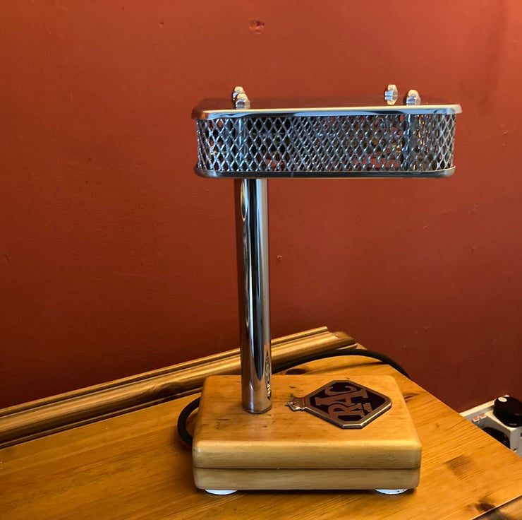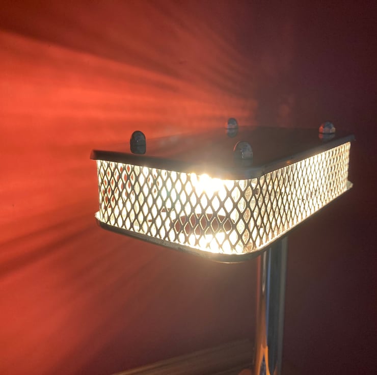 I bought a job lot of vintage NOS aftermarket air filters, this lamp uses one as a shade and a vintage RAC badge to operate a touch sensitive switch hidden in the base, an idea I’ve been thinking of for a while finally brought to fruition.
