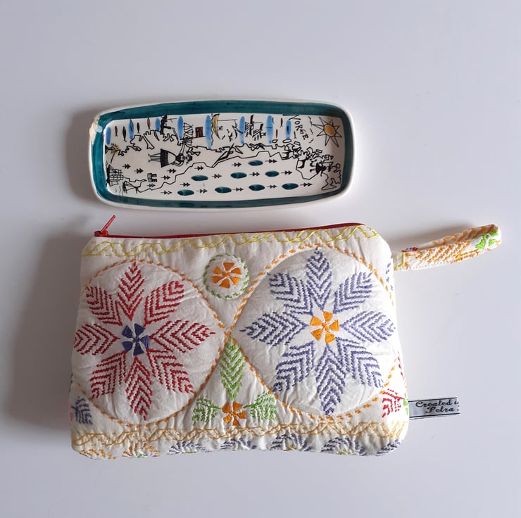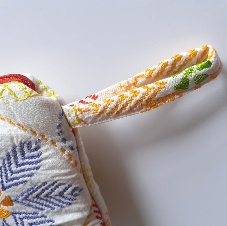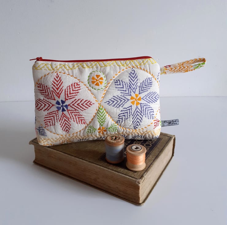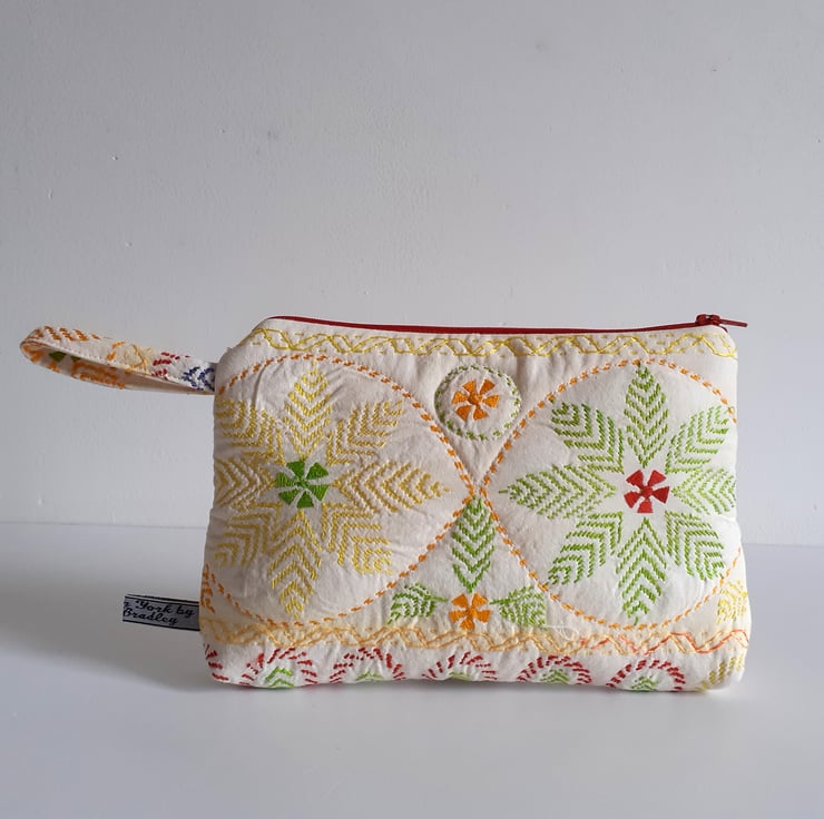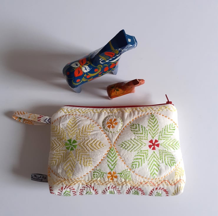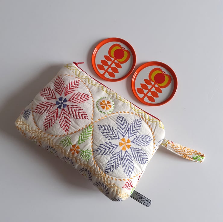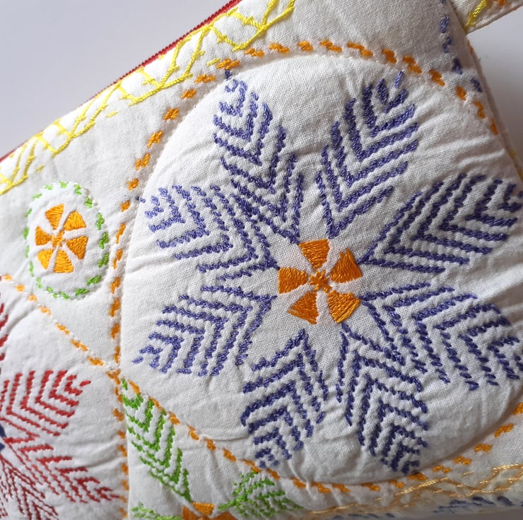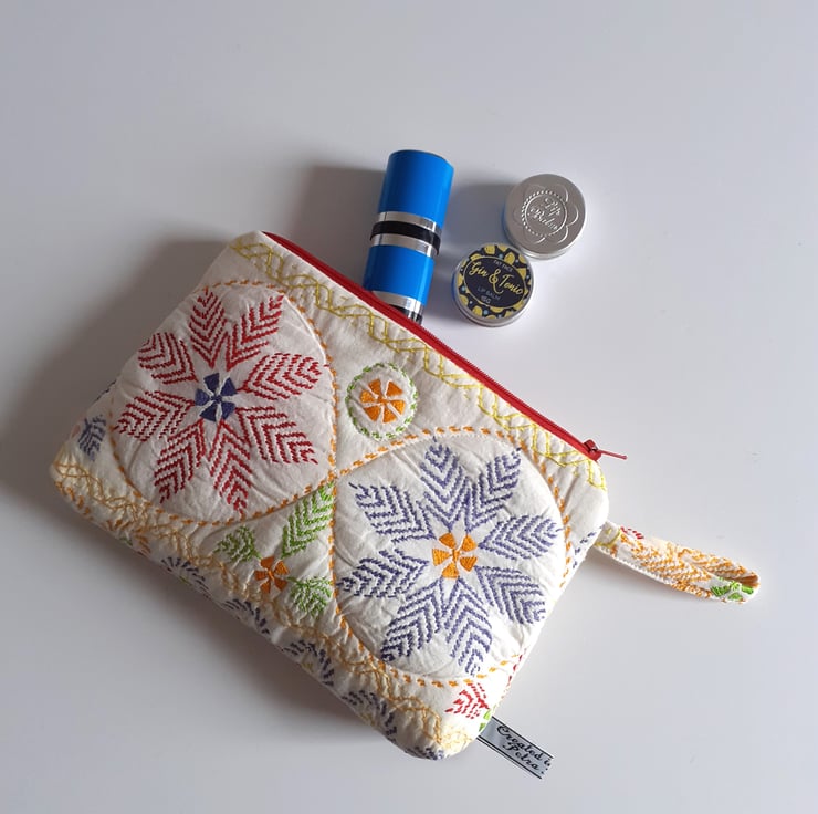 This upcycled and embroidered padded zip up bag, is perfect for make up and storing more delicate items. Its light padding gives it some protection, making it useful for storing jewellery, specs or as a suitcase organiser. It is made from a charming piece of upcycled machine embroidered calico with a folk art feel, which I bought from the York car boot in the summer. By stitching over the embroidered patterns and adding some wadding, I was able to give it a some added body. It would make a lovely spring weekend bag, as a travel bag for jewellery or as a mothers day present.