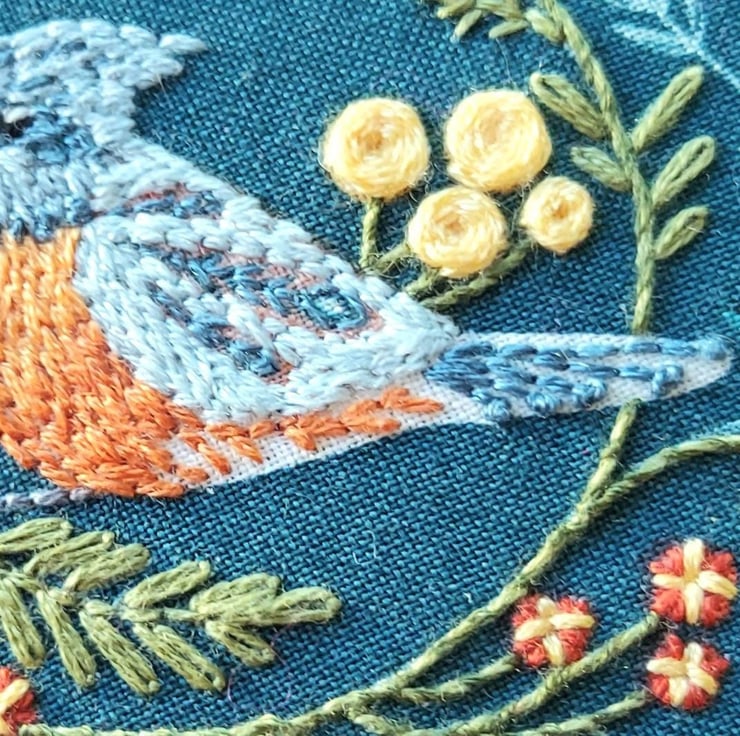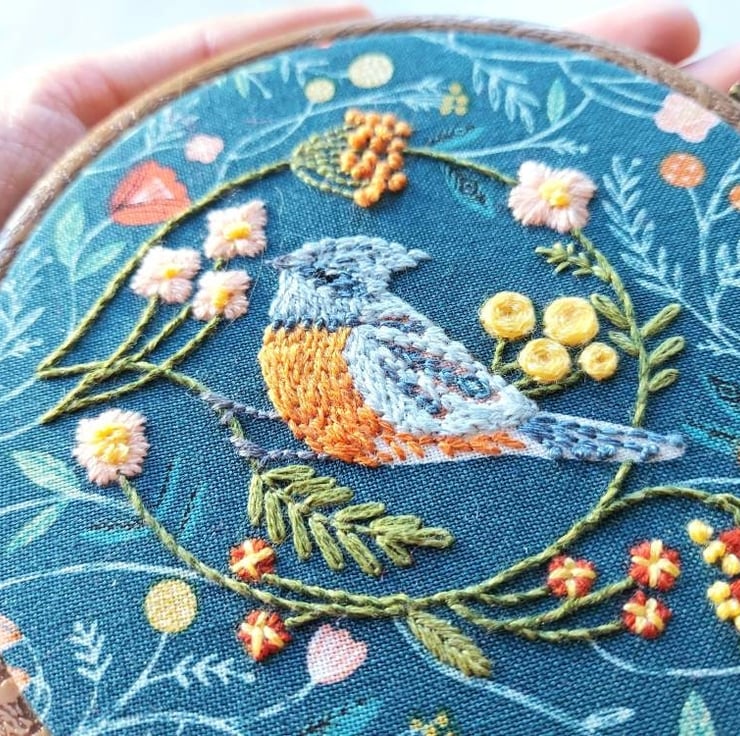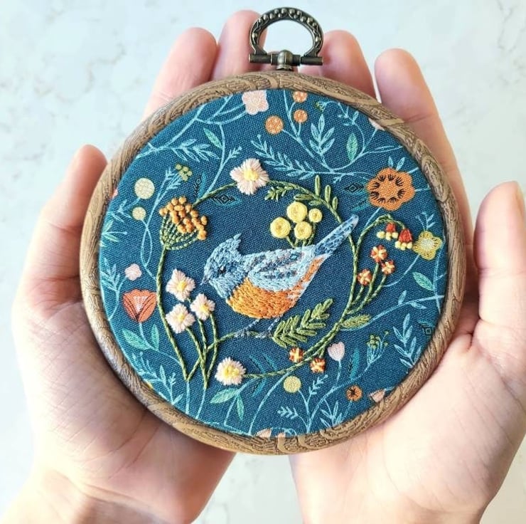 Pretty little Nuthatch hoop art. Fabric print with delicately hand embroidered details in gorgeously rich colours.