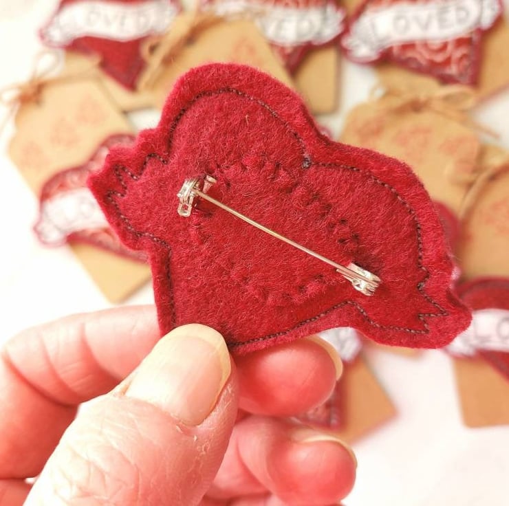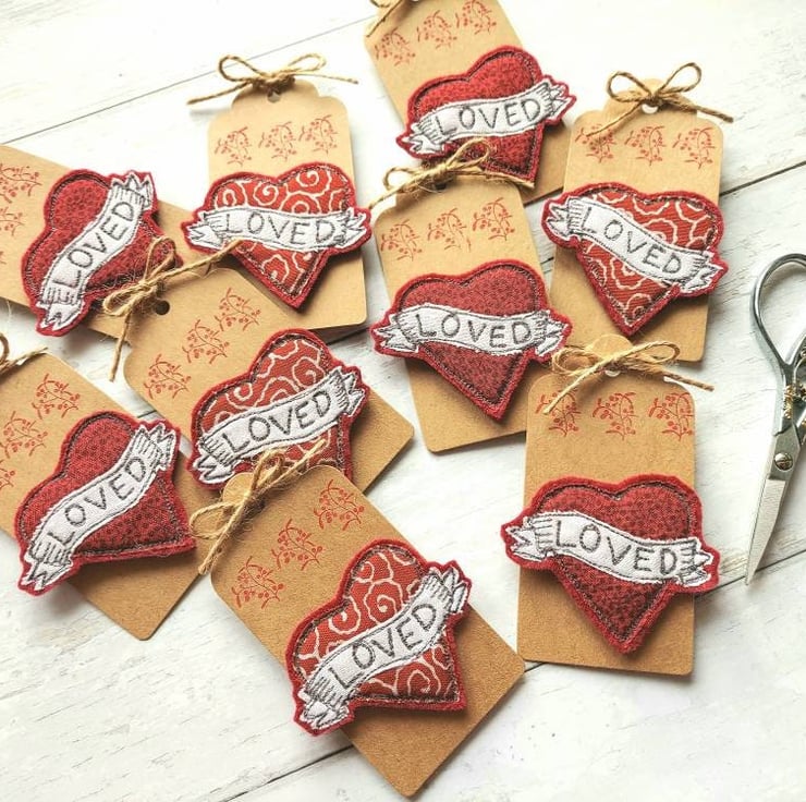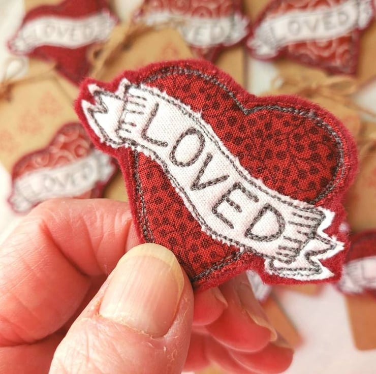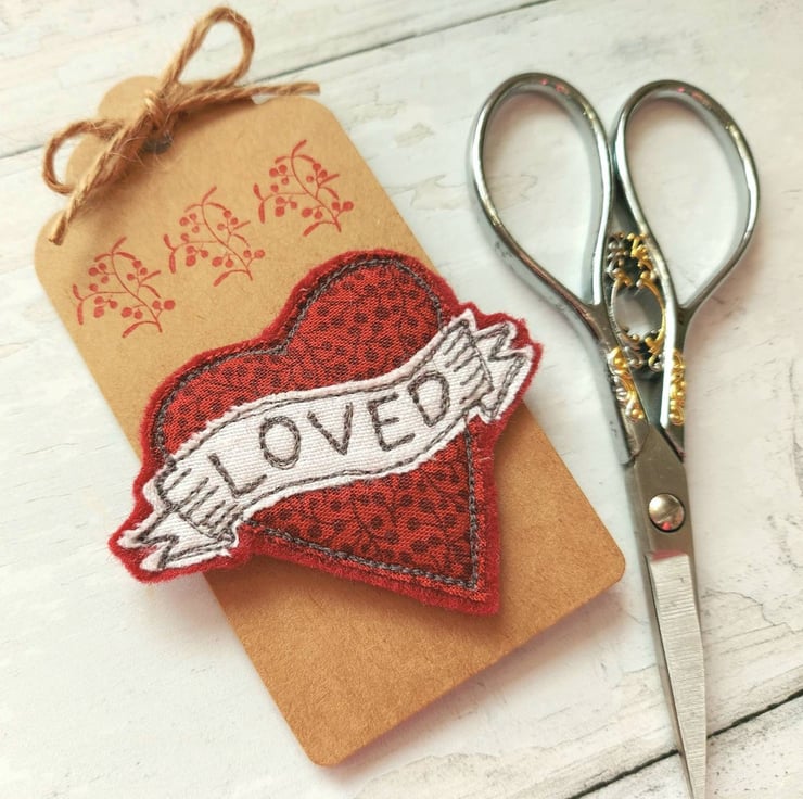 Beautiful handmade 'Loved' brooch made using freemotion machine sewing and appliqued fabric, onto a felt backing.