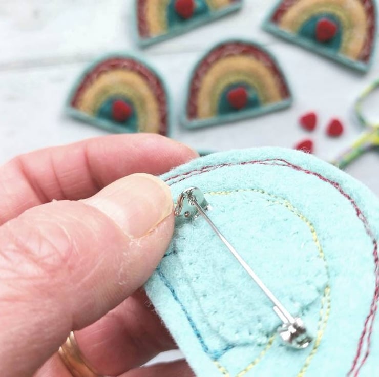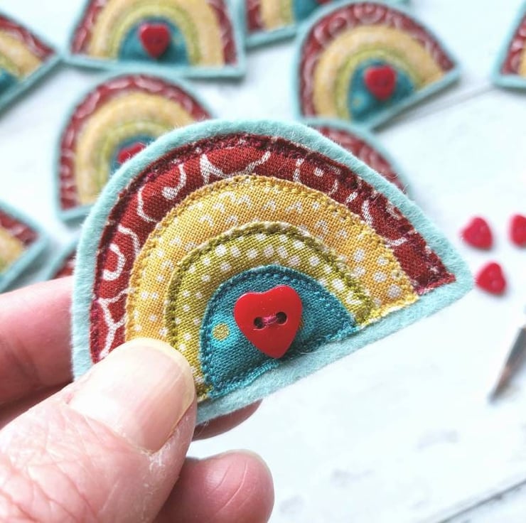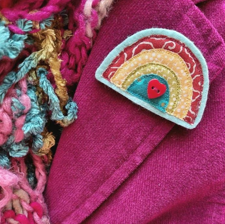 Beautiful handmade applique rainbow brooch made using freemotion machine sewing and appliqued fabric, onto a felt backing. Embellished with a tiny heart.