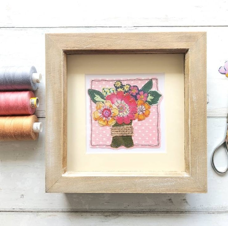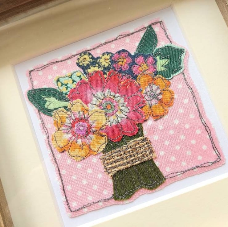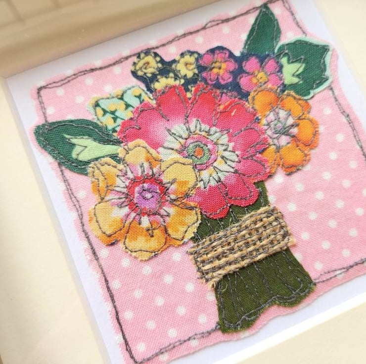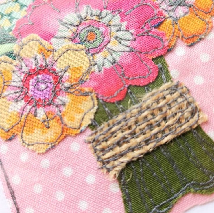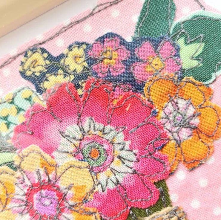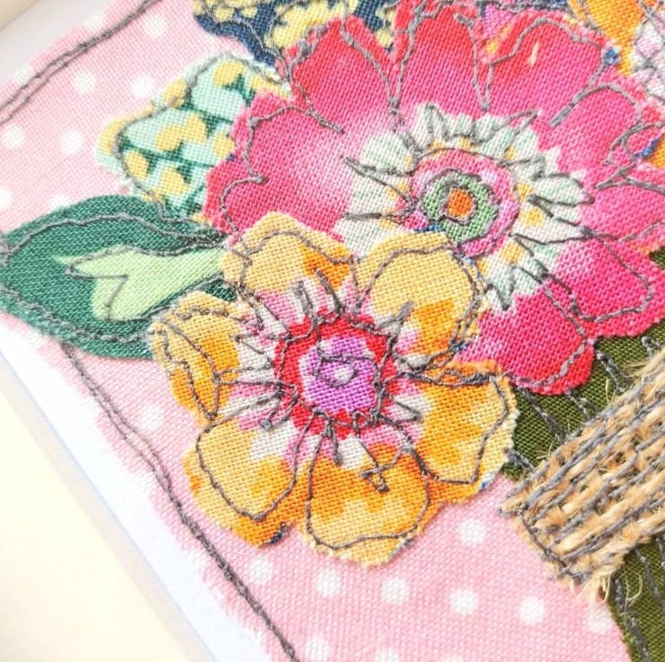 I love a pop of colour and used some of the beautiful floral fabrics in my fabric stash to create posies for freemotion sewn pictures and cards.