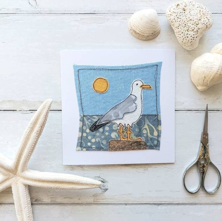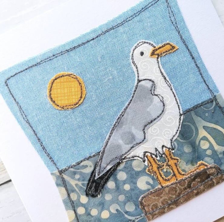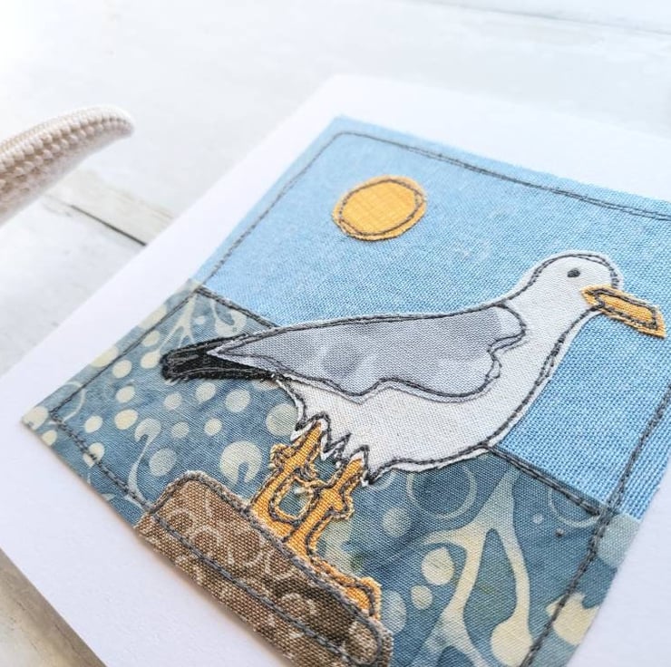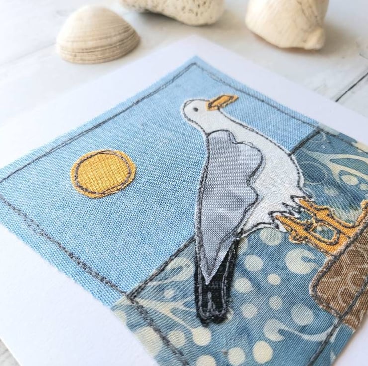 Beautiful handmade card with freemotion sewn seagull with raw edge applique.