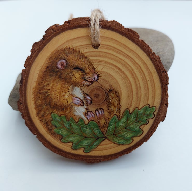 Dormice are beautiful creatures and this one is snoozing on a cute little log slice. It's created using pyrography, which is burning on wood, and coloured using acrylic ink and coloured pencils. The log slice is finished with linseed oil.