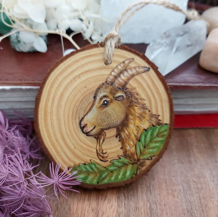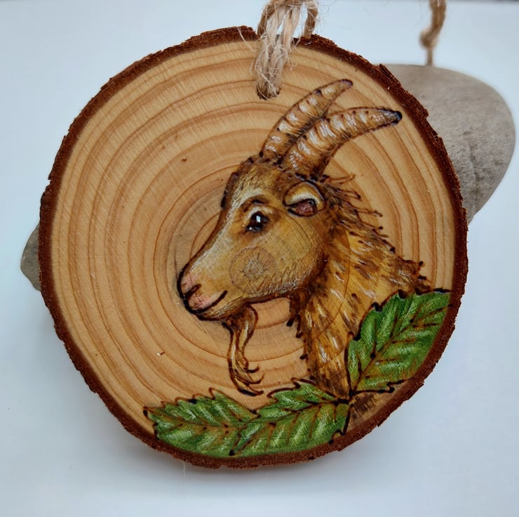 I love the sheer determination of goats, this one is on a cute little log slice. It's created using pyrography, which is burning on wood, and coloured using acrylic ink and coloured pencils. It's finished with linseed oil.