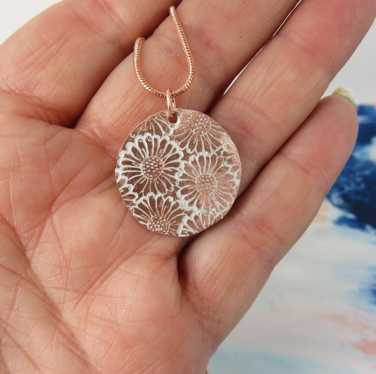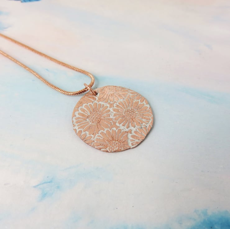 A 22mm copper circle has been textured with a daisy pattern. The back is enamelled in white. The front is then washed with enamel and fired in a kiln to pick out the pattern and raised areas polished to a shiny copper. It hangs on an 45cm rose gold plated chain. It is posted out in a 830degree gift box. A unique gift.