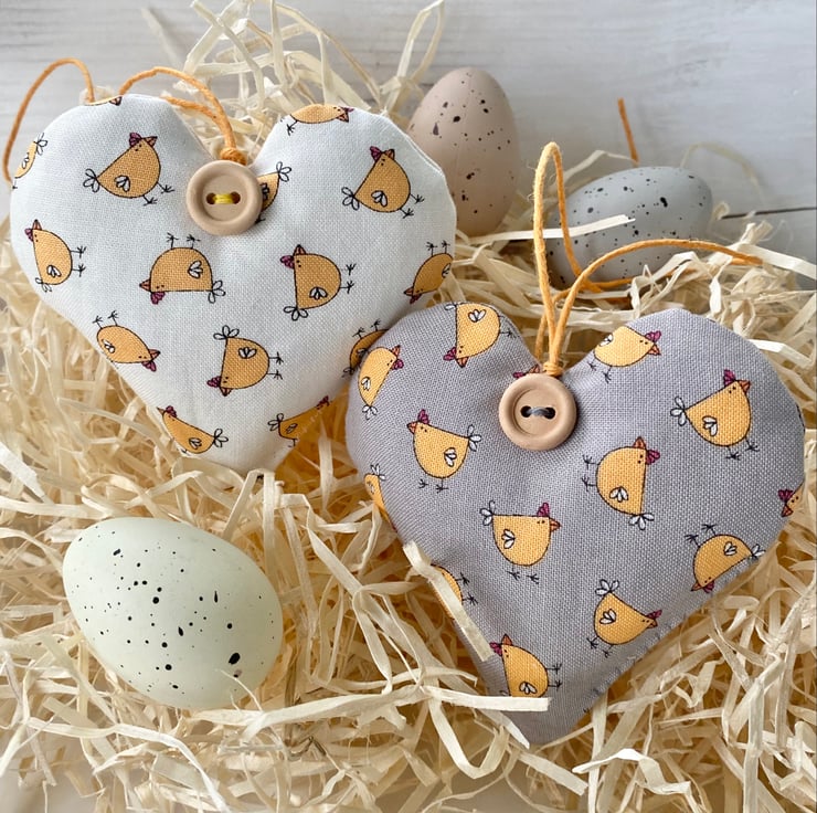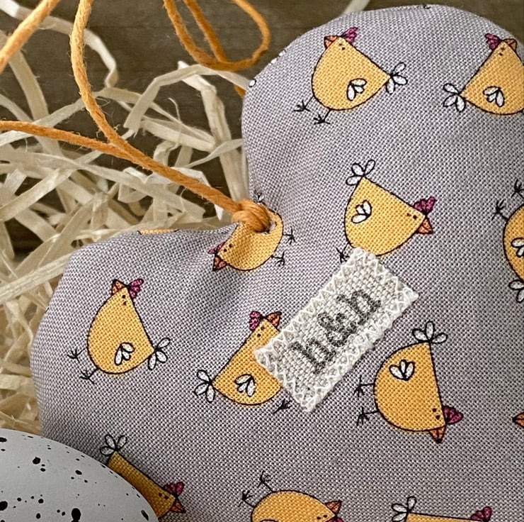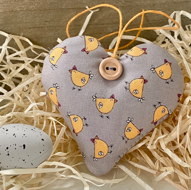 Super cute cheerful yellow chicks tumble front and back on this Easter heart decoration.