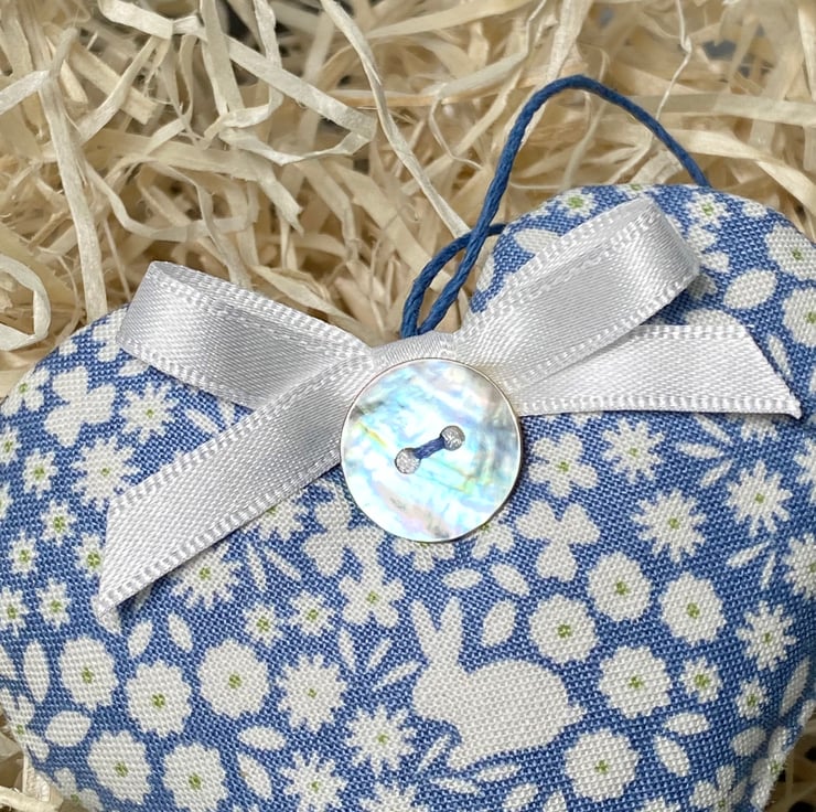 Packed with super fragrant Hampshire lavender or with toy-grade stuffing (wool or polyester) and hand finished with a delicate mother-of-pearl button, a white satin ribbon bow and blue hemp twine hanging ties.