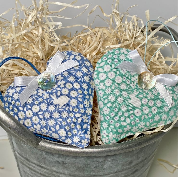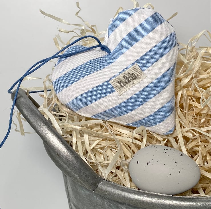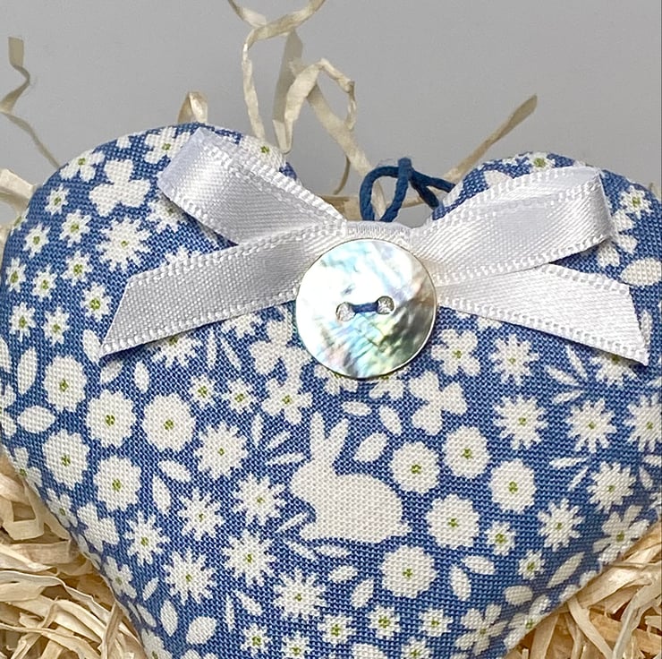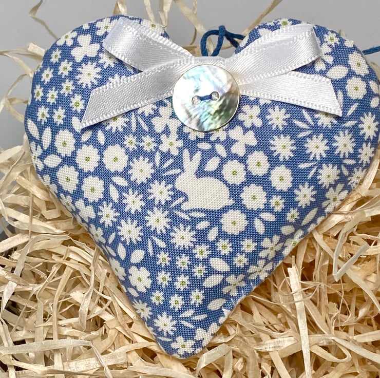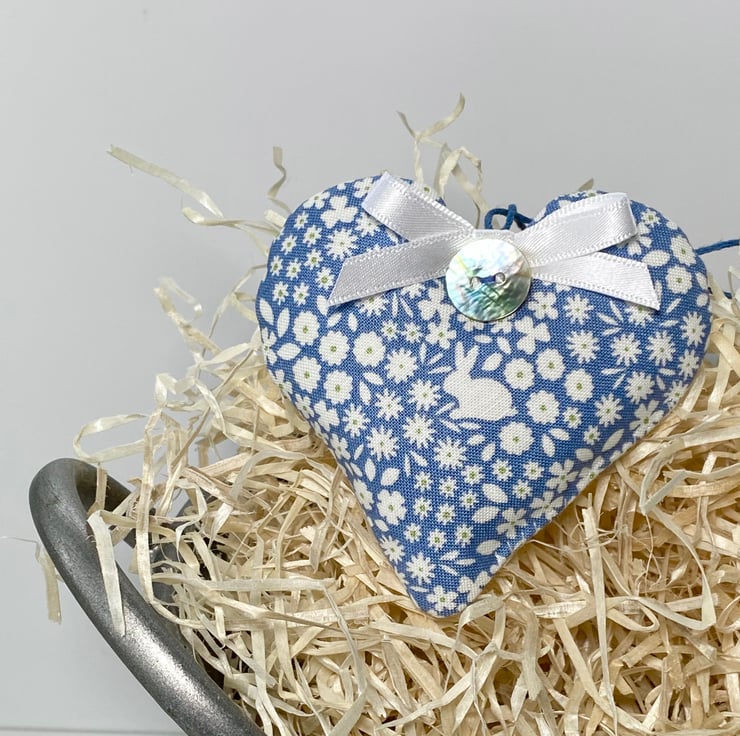 A little white Easter rabbit hides amongst a scattering of pretty white flowers on this misty grey-blue heart decoration. The reverse side is in toning mid-blue and white stripes.