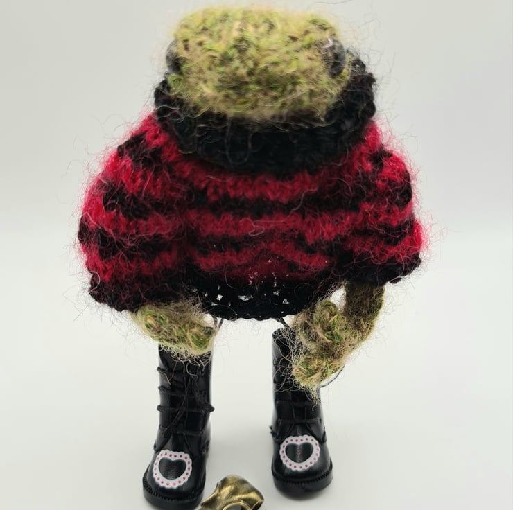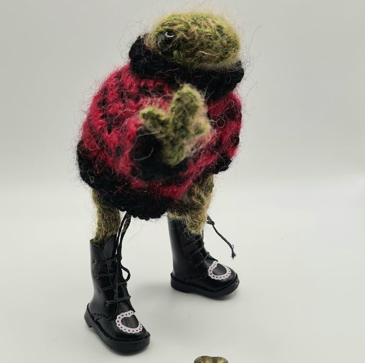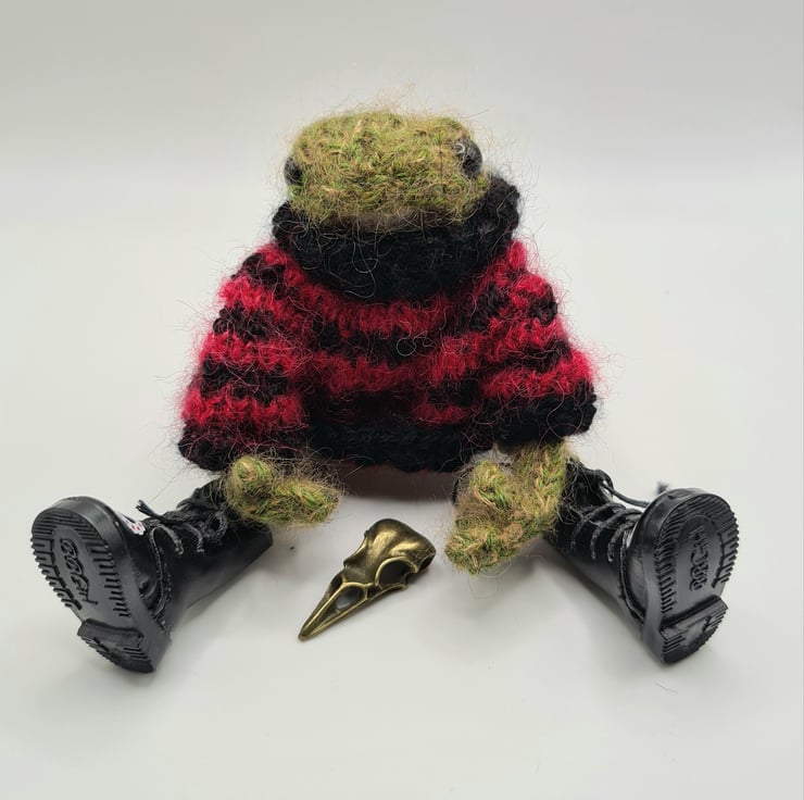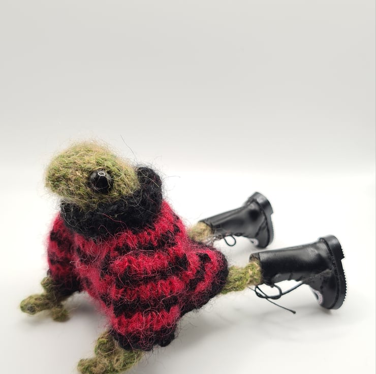 Hand made collectible knitted punk frog with Jumper and boots. Arms and legs are poseable. Around 5" tall made from Alpaca, Kid Mohair and silk. Not suitable for children due to wire armature, small parts and very fluffy yarn. OR DESIGN YOUR OWN FROG. MESSAGE ME FIRST TO DESIGN YOUR OWN SWEATER