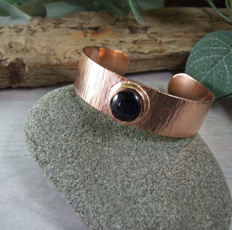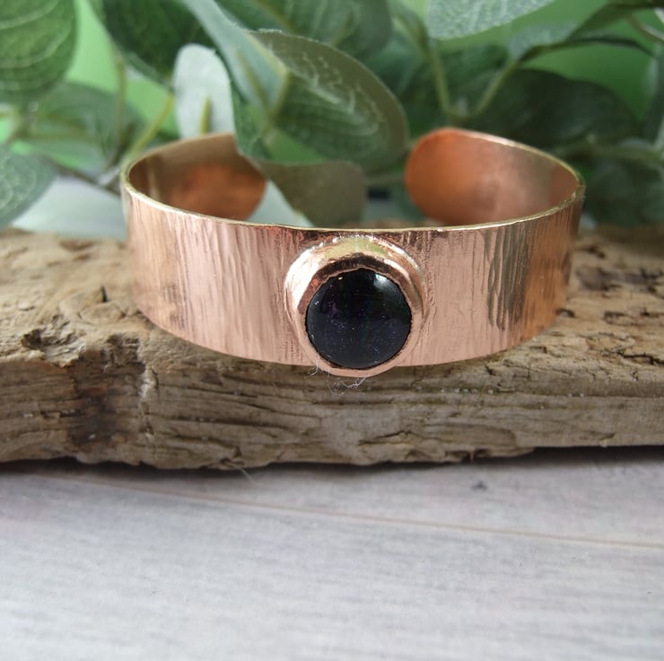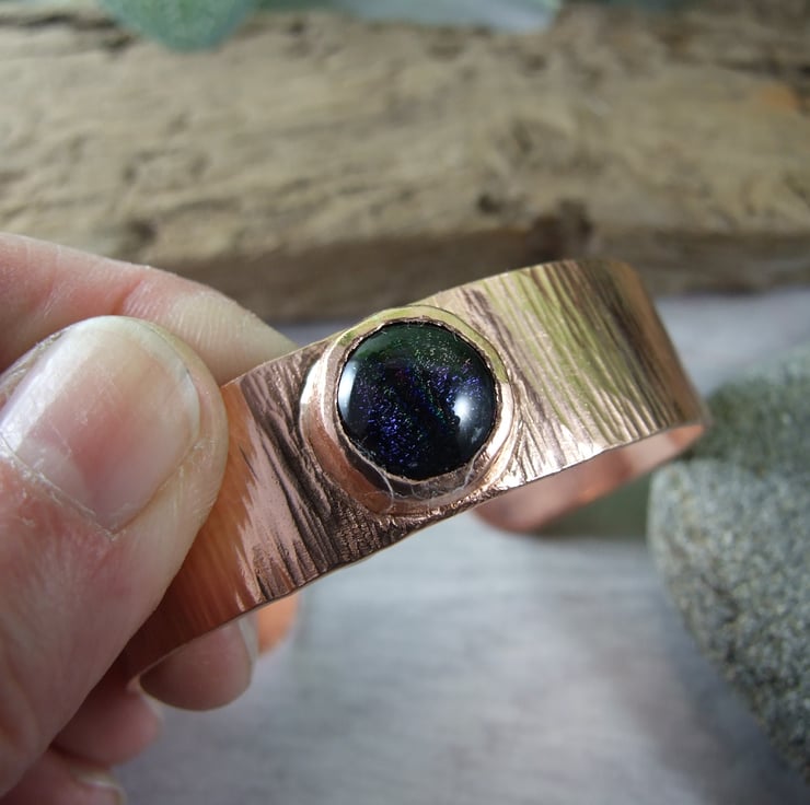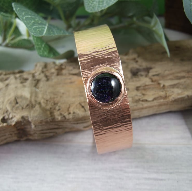 Copper Cuff Bangle with handmade deep purple dichroic glass cabachon and bark textured finish. Medium fit to suit 6-7 inch wrist.