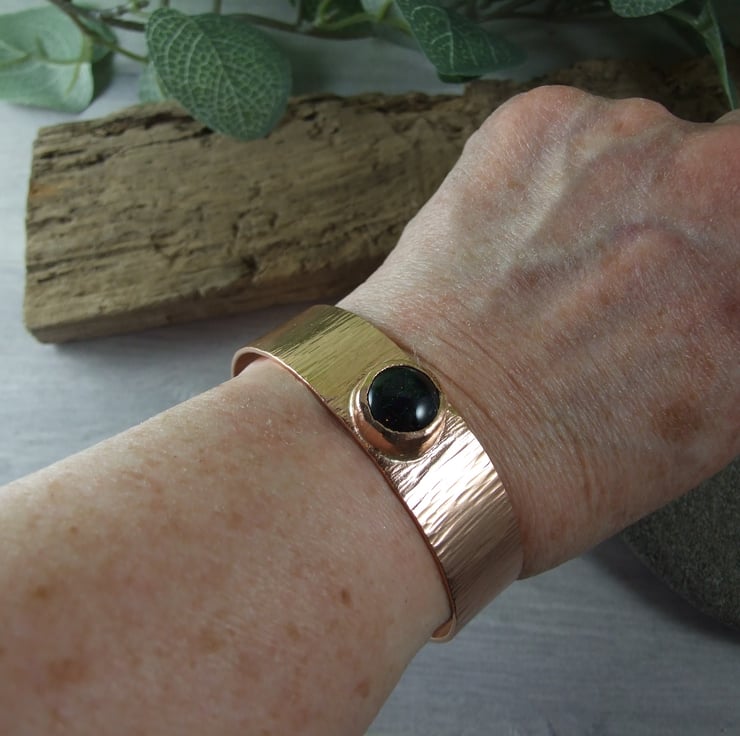 I have made the bangle from 18mm wide x 1.2mm thick solid pure copper shaped and forged by hand and given a bark efefct texture with a hammer. At the centre I have set one of my own dichroic glass cabachons in deep purple. I make the glass cabachon by laying up small pieces of glass then kiln firing so they merge together to form a natural organic dome shape.