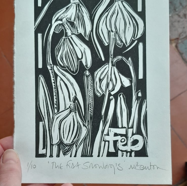 Sketches made, I decided upon the simple, bold composition, deciding to keep the background dark to emphasise the bright white flower heads. I then transferred the image onto a traditional hessian backed lino. This I hand cut and then burnished onto a lovely Japanese Hosho paper. The paper measures approx. 14cm x 20cm with the printed image itself at 10cm x 15cm approx.