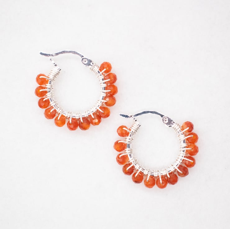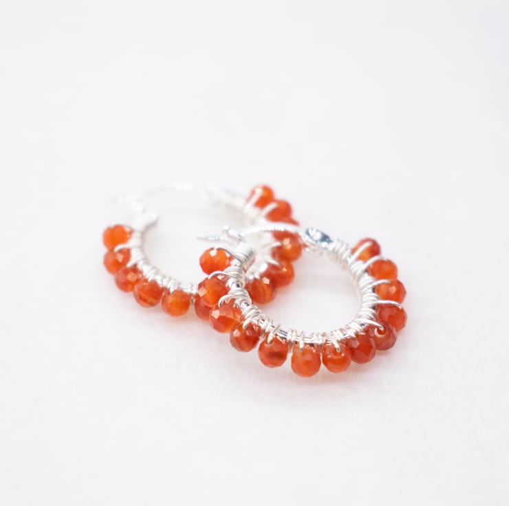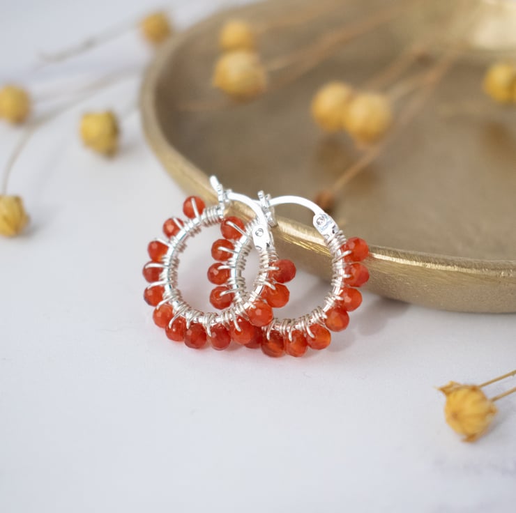 Small silver wire wrapped hoops with Carnelian gemstones. Pretty, boho style earrings perfect for everyday wear.