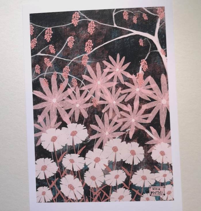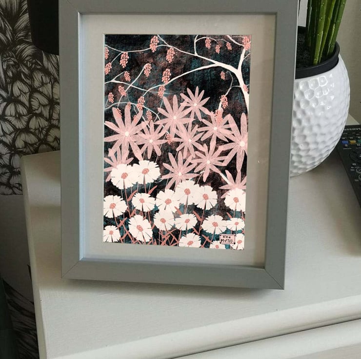 This is an A4 print of my daisy garden in pink illustration. A pink and cream floral garden with a dark background that allows the flowers to sing.