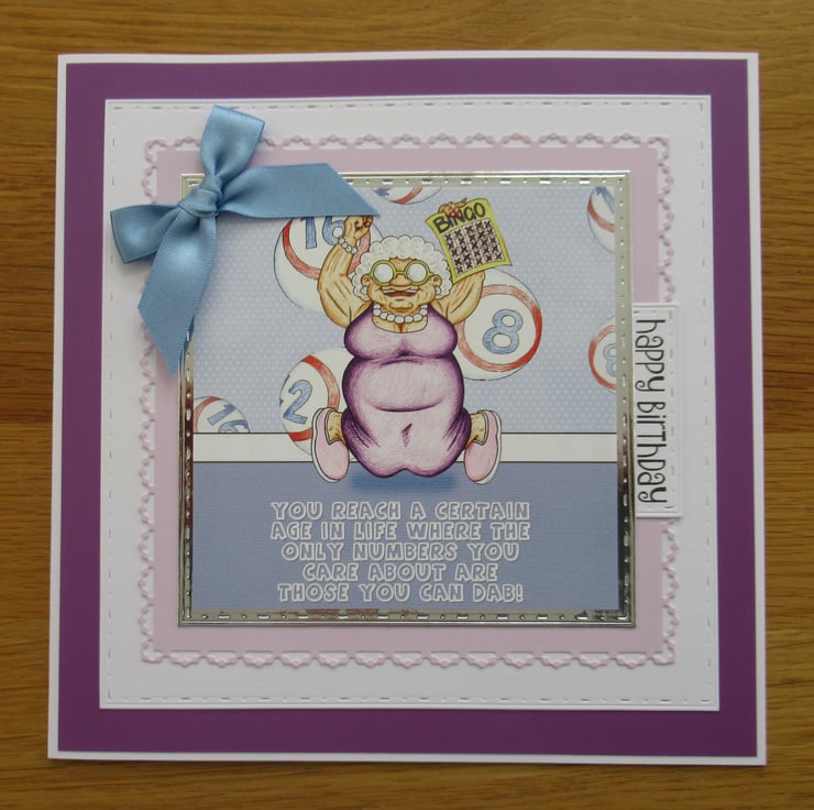 This lovely card in lavender tones features the image of a Grandma enjoying herself playing Bingo, alongside a comical greeting. I used decorative dies to cut layers from lilac and white card which frame the image and placed them all upon a lavender coloured background card. I added a birthday greeting down one side, a blue satin bow and the inside has been finished to coordinate with a stamped verse as pictured.
