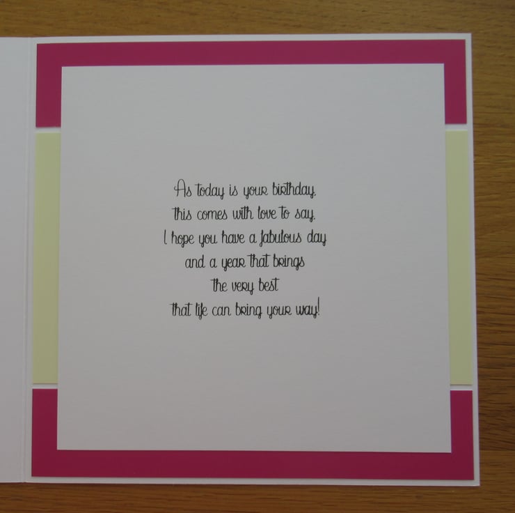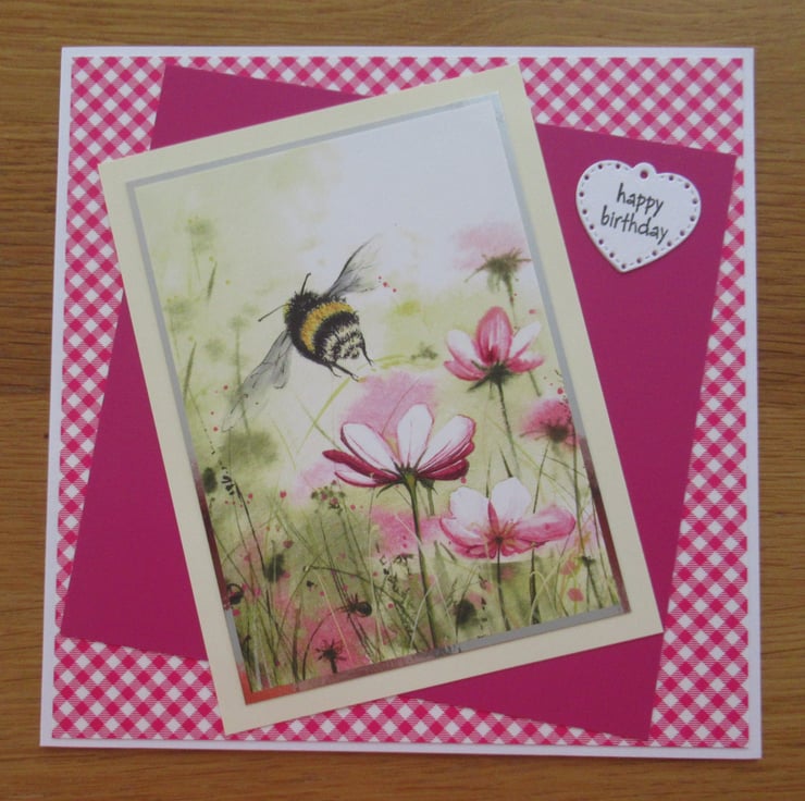 I began this card by chosing a bright pink gingham background card to pick up on the colour of the flowers in the picture. The image itself has a bumblebee hovering above some bright pink daisies. It has been framed with silver and pale yellow card with a deep pink layer underneath. These have been off set at an angle and I added a heart shaped Happy Birthday greeting. The inside has been finished to coordinate with a stamped birthday verse as pictured.