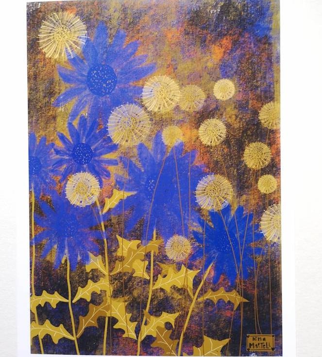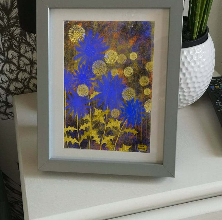 This is an A4 print of my azure blue and gold garden illustration. A garden full of azure big and bold flower with gold dandelion seed heads.
