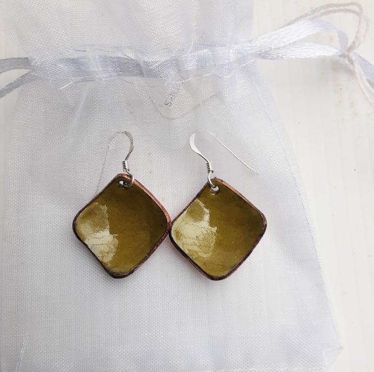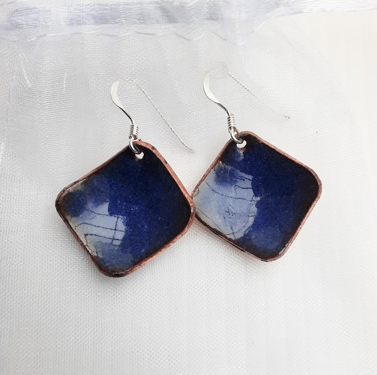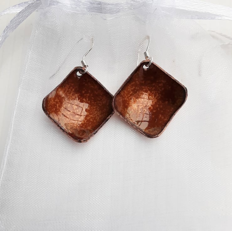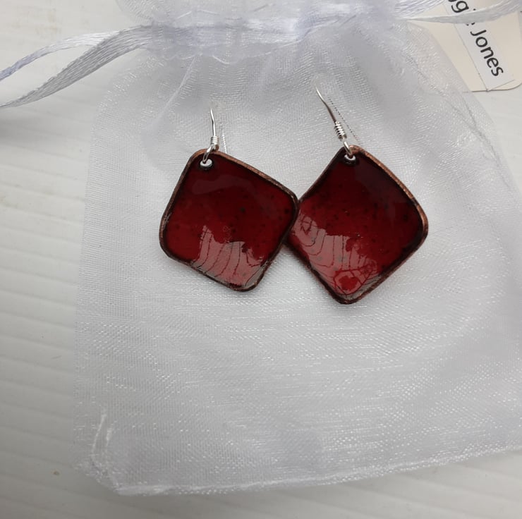 These delightful earrings are approximately 20mm x 20mm. Made from copper, they have been domed, then enamelled, fired at 800 degrees C, Three coats of enamel each time fired in my kiln to give depth of colour. The copper has been highly polished and sterling silver hooks added.